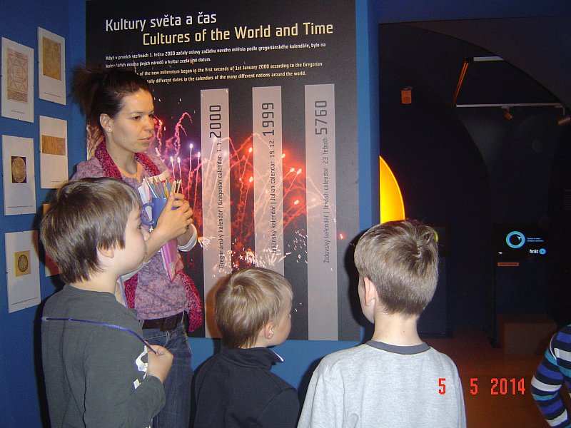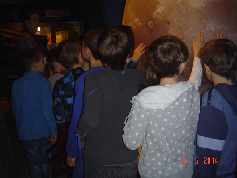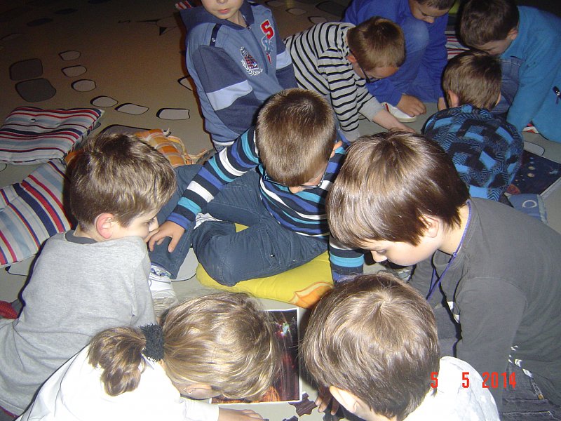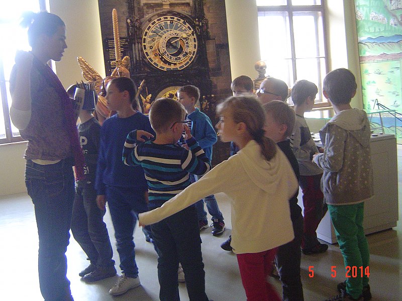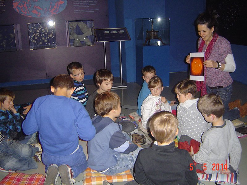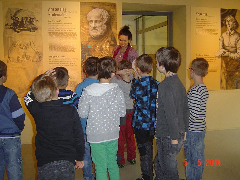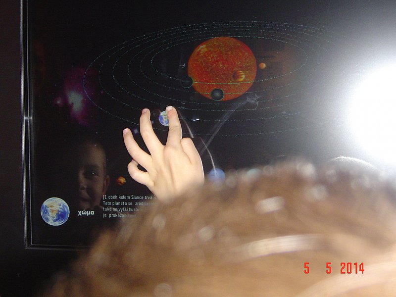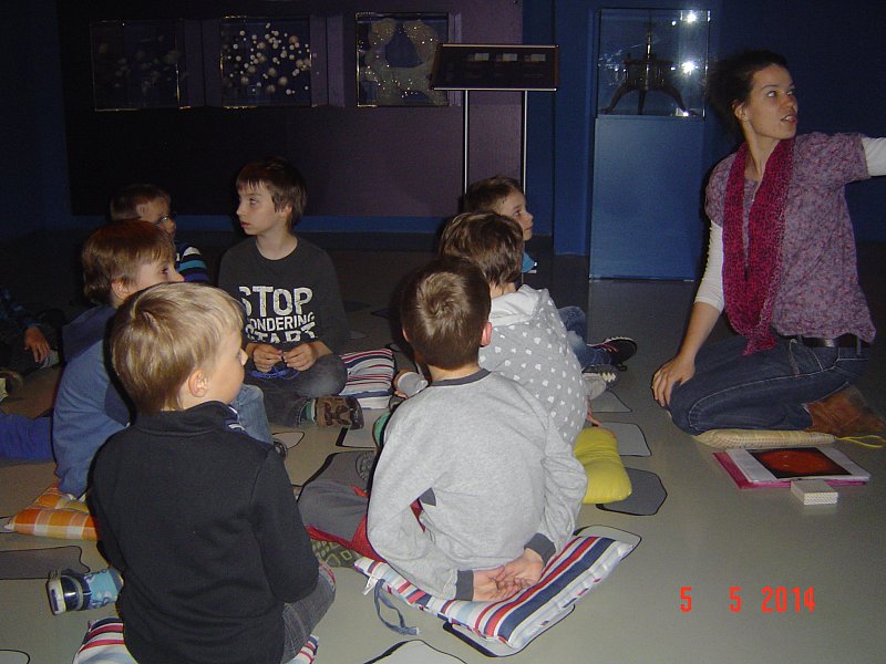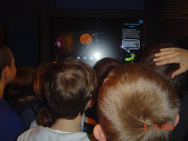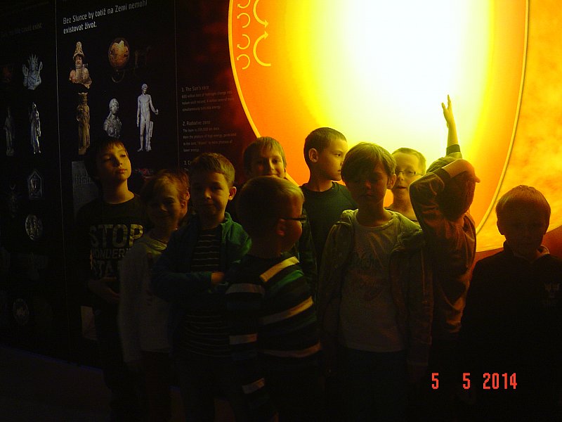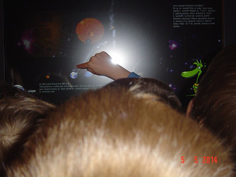 Nejprve jsme se ocitli ve vesmíru. V úvodní besedě jsme se dověděli mnoho nového, ale uplatnili jsme také naše znalosti. Ve hře jsme si zkusili napodobit pohyby planet v naší sluneční soustavě. Pak jsme ji skládali z puzzlí. Na interaktivním panelu jsme umístili na oběžnou dráhu jedlotlivé planety, sáhli jsme si na Slunce, Zemi i Měsíc. Seznámili jsme se s kalendáři různých kultur a národů, s vynálezci a jejich objevy o vesmíru. V expozici hodin jsme se seznámili s funkcí kyvadla, které je základem hodin a tudíž měření času. Na pracovním listu jsme měli detaily hodin a my jsme vyhledávali, ke kterým hodinám patří. Na závěr jsme se vyfotili modelem Hubblova teleskopu.
