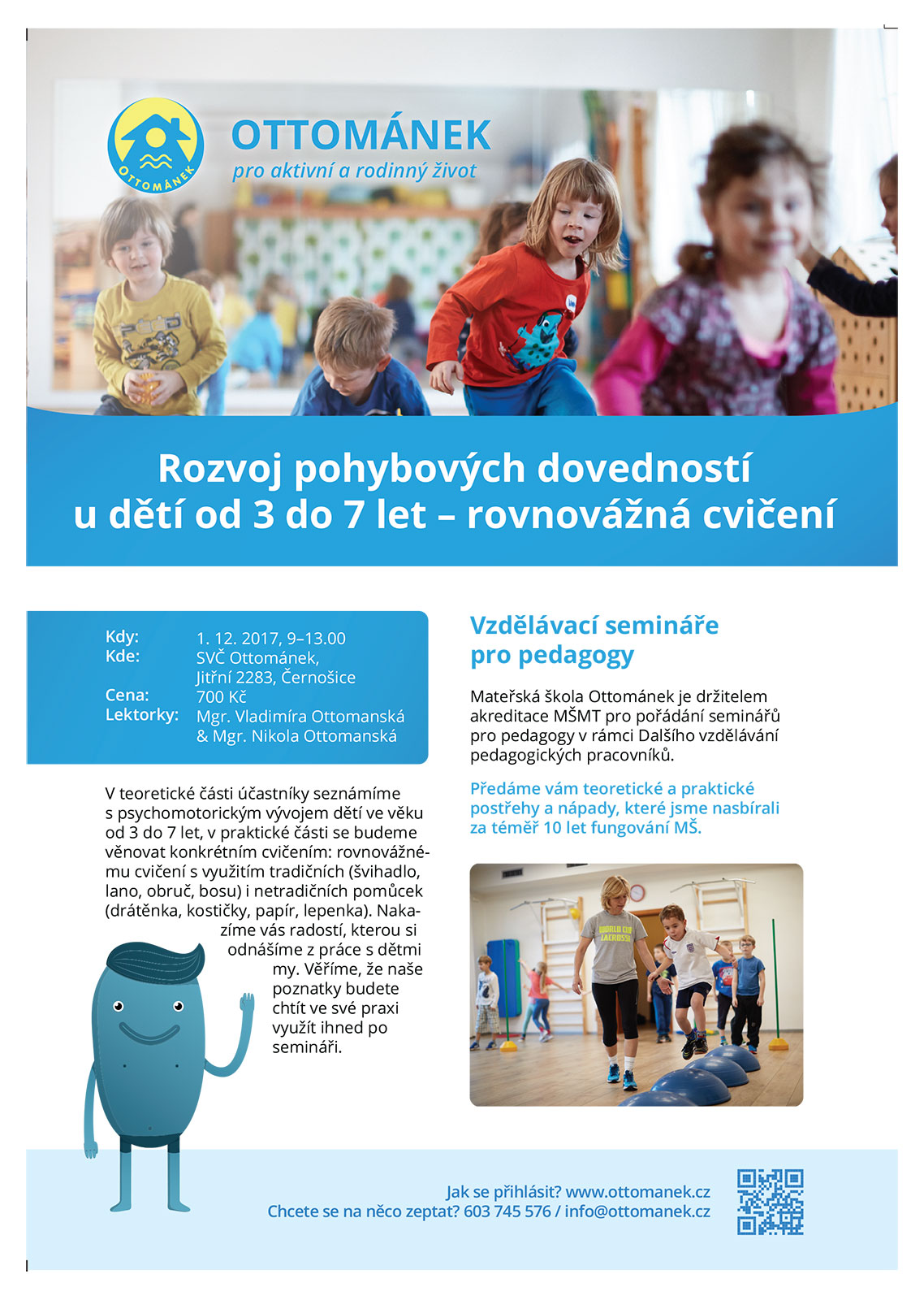 Mateřská škola Ottománek je držitelem akreditace MŠMT pro pořádání seminářů pro pedagogy v rámci Dalšího vzdělávání pedagogických pracovníků. Předáme vám teoretické a praktické postřehy a nápady, které jsme nasbírali za téměř 10 let fungování MŠ.