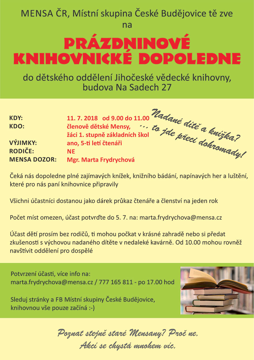 Čeká nás dopoledne plné zajímavých knížek, knižního bádání, napínavých her a luštění, které pro nás paní knihovnice připravily. Všichni účastníci dostanou jako dárek průkaz čtenáře a členství na jeden rok. Počet míst je omezen, účast prosím potvrďte do 5. 7. na e-mail marta.frydrychova@mensa.cz.