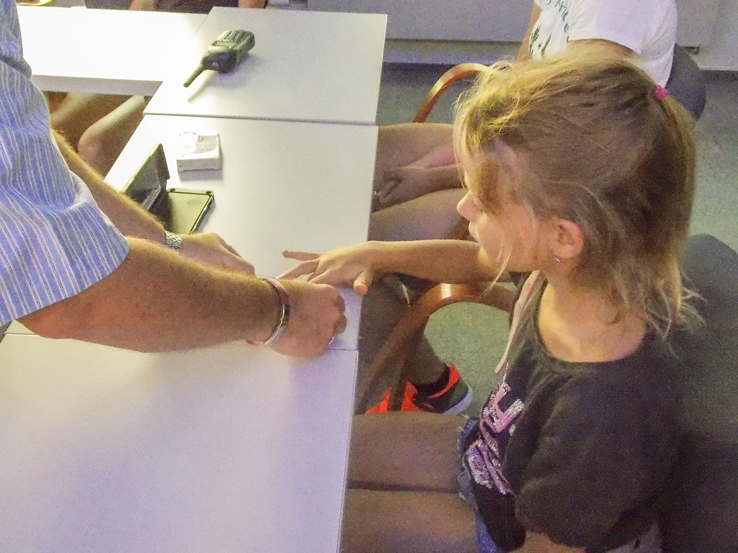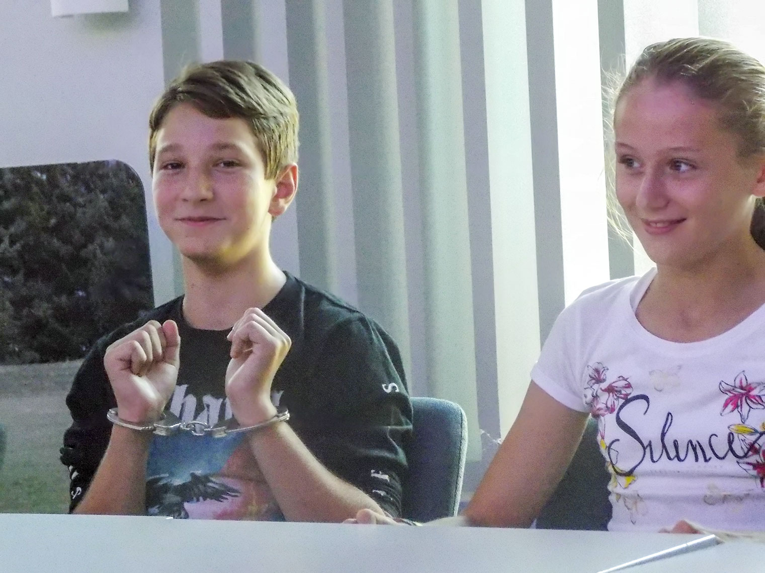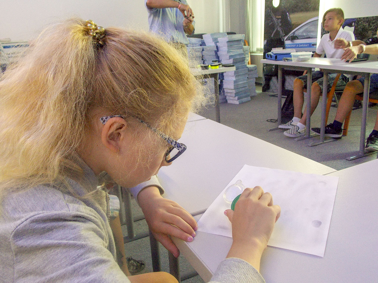 Ale konec teorie, přišli jsme zkusit práci detektivů, tak hurá na to. Pomocí kovových pilin zkoušíme sejmout neviditelné otisky prstů z listu papíru, poté přecházíme k činnosti náročnější – Niké a Emča vytěžují stopy ze sklenky, ze které před chvilkou pila Majda. Na chvilku se stáváme i pachateli, Martin končí v policejních poutech, Alžbětce a Leničce jsou otisky odebrány.