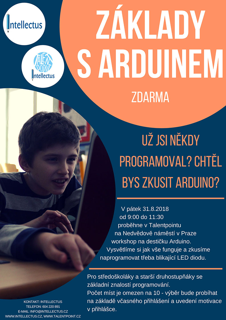 Už jsi někdy programoval? Chtěl bys zkusit Arduino? V pátek 31. srpna 2018 od 9:00 do 11:30 proběhne v Talentpointu na Nedvědově náměstí v Praze workshop na destičku Arduino. Vysvětlíme si, jak vše funguje a zkusíme naprogramovat třeba blikající LED diodu. Akci nepořádá Mensa ČR.