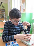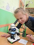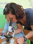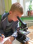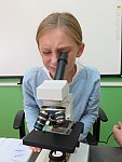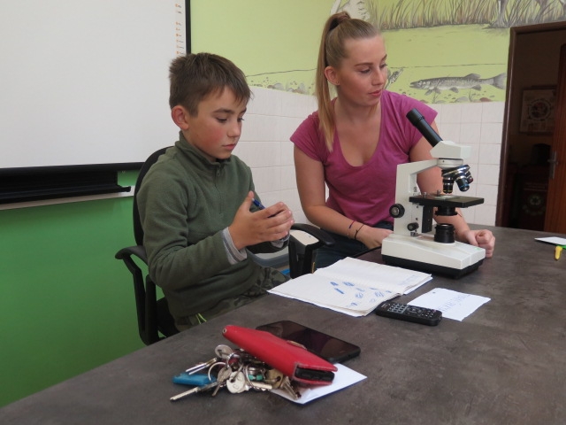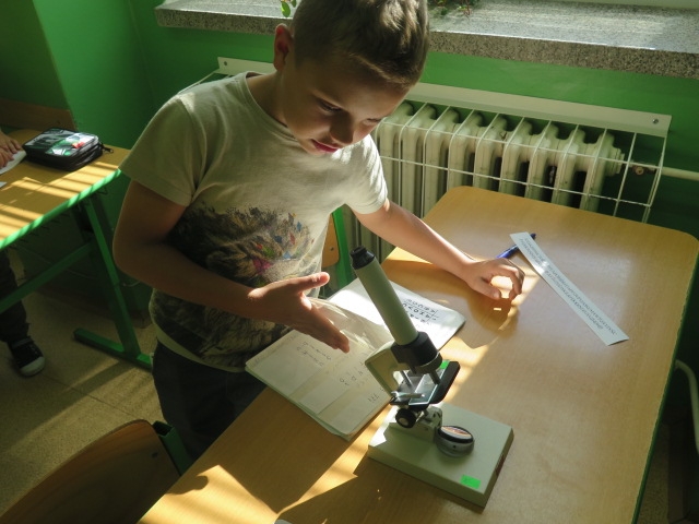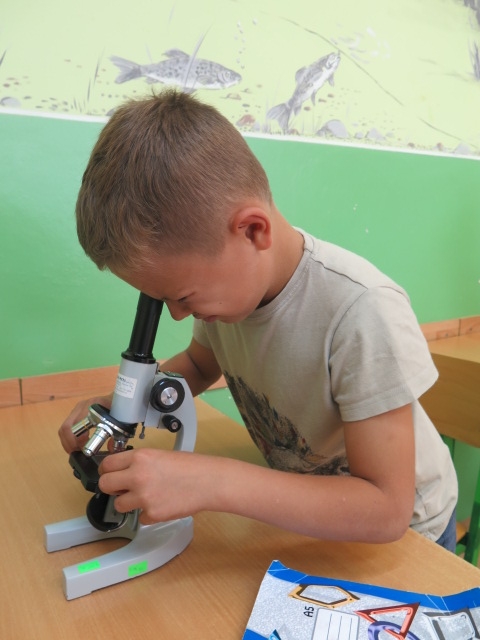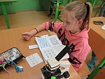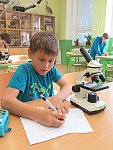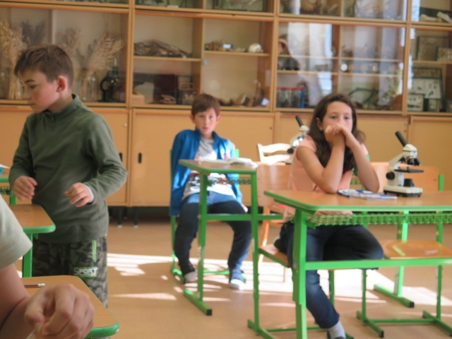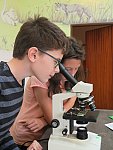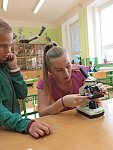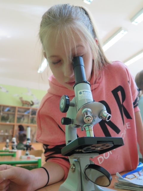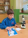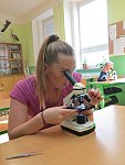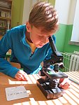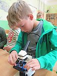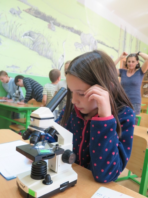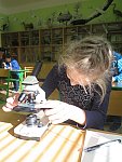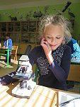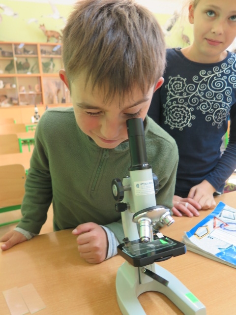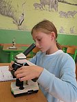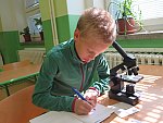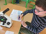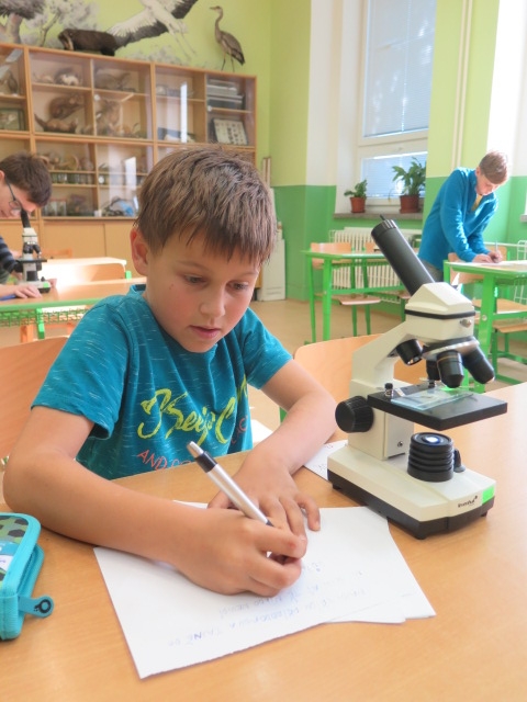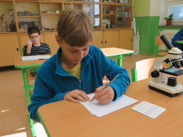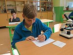 Nováčci i mazáci se s chutí pustili do luštění. Po chvilce již někteří měli vyluštěno a opouštěli potichu a tajně třídu, což bylo jejich úkolem. Měli se nenápadně přemístit do učebny přírodopisu a začít plnit úkoly. Tam jsem měla připraveno 17 mikroskopů s preparáty. U každého mikroskopu jsme měli kartičku se zašifrovaným preparátem. Úkolem bylo vyřešit, prozkoumat v mikroskopu a 5 vybraných vzorků nakreslit do sešitu. Zbylé vzorky si vyluštili a zapsali do sešitu.