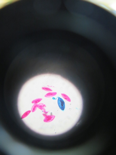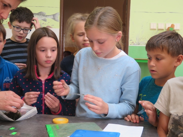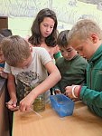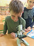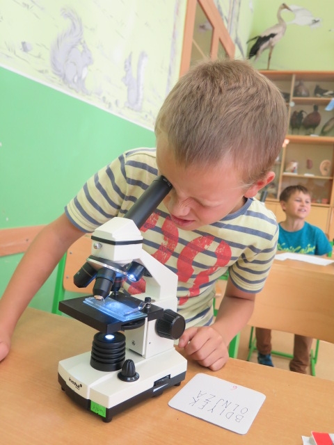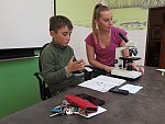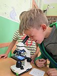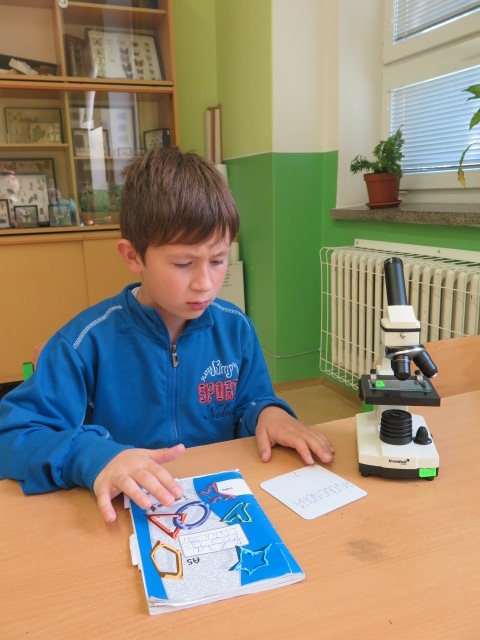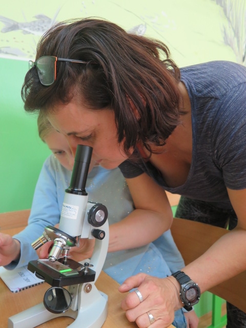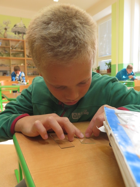 Když všichni splnili tuto část, vysvětlila jsem dětem, jak se takový preparát připravuje, co je podložní sklíčko, jaké je zvětšení mikroskopu a poté si každý připravil pro ostatní preparát z čehokoli, co ho napadlo. Někdo si vytrhl vlas nebo chlup, zajímavé byly vzorky prachu ze země nebo molitanu ze židle, prozkoumali jsme i některé tělní tekutiny či vzorek toaletního papíru.