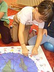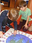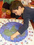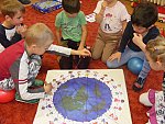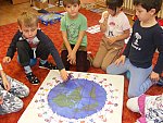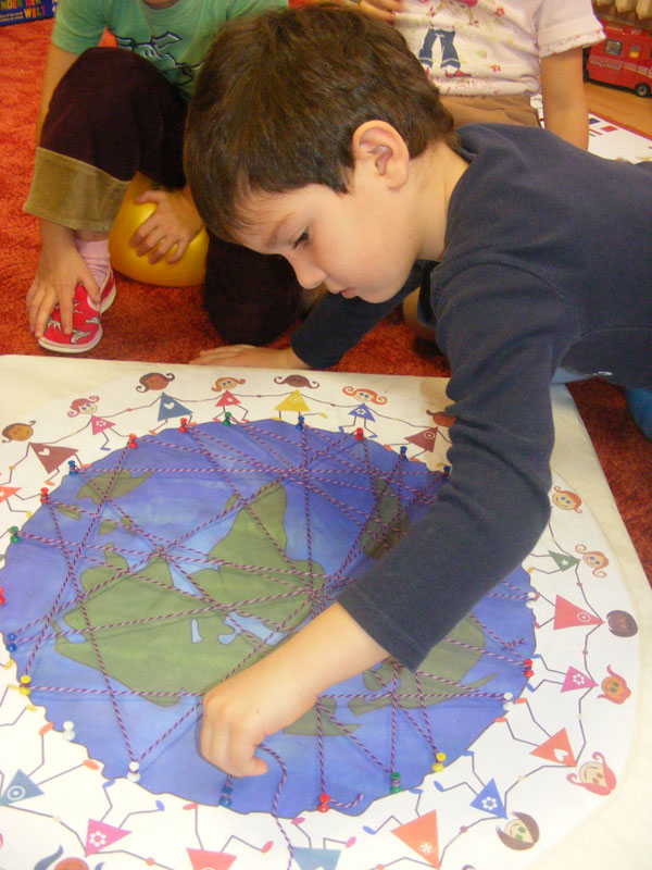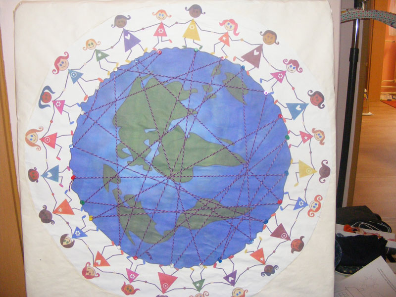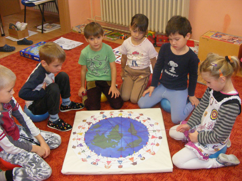 Na velké polystyrenové nástěnce je vyobrazena planeta Země se všemi kontinenty a kolem ní děti různé barvy pleti v různém oblečení. Děti vlnou na špendlíky namotávaly bavlnku, dle pokynů učitelky: „najdi černošskou holčičku, červené šaty s bílou hvězdičkou, ...“ V tomto konkrétním místě omotaly vlnu a pokračovalo se dál, až se spojily všechny vyobrazené děti kolem zeměkoule.