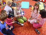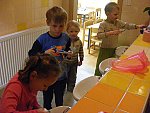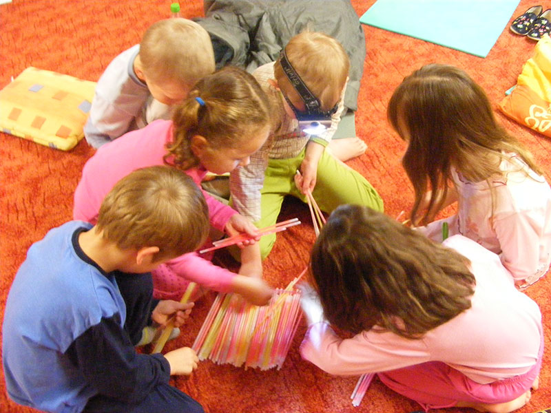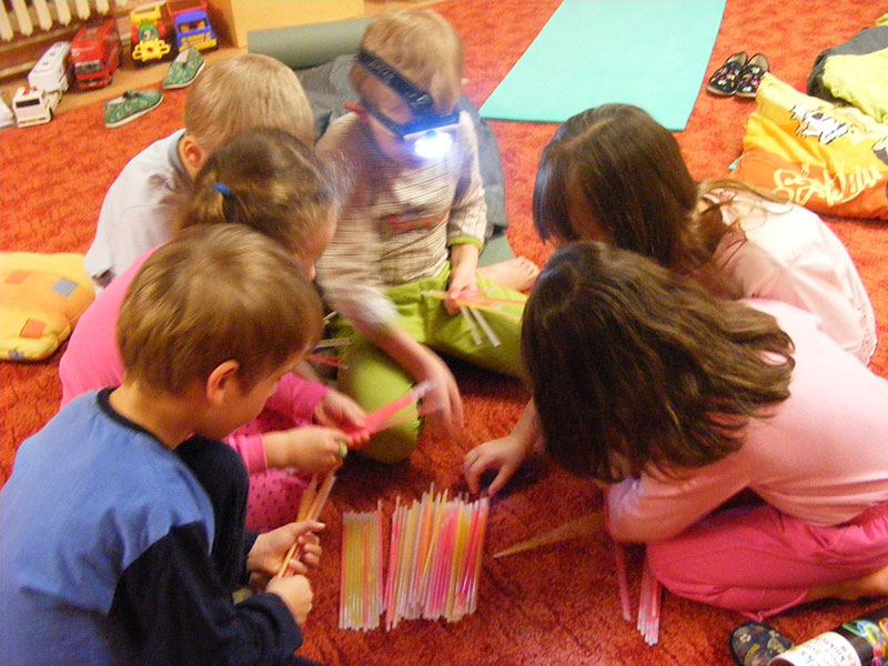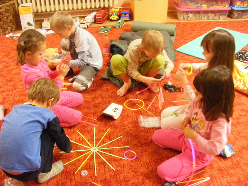 Po návratu nás čekala příprava „pelíšků“ na nocování ve školce a rozloučení s rodiči. Po vyčištění zoubků jsme hráli Bobříka odvahy. Všichni jako jedna parta jsme hledali schované překvapení ve zcela zhasnutém prostoru třídy a v jejím okolí. Použít jsme mohli pouze baterky, které jsme si přinesli z domova. Vše se úspěšně zdařilo a s radostí jsme objevili svítící tyčinky, ze kterých jsme vytvářeli náramky, korále a velkou hvězdu na zavěšení.