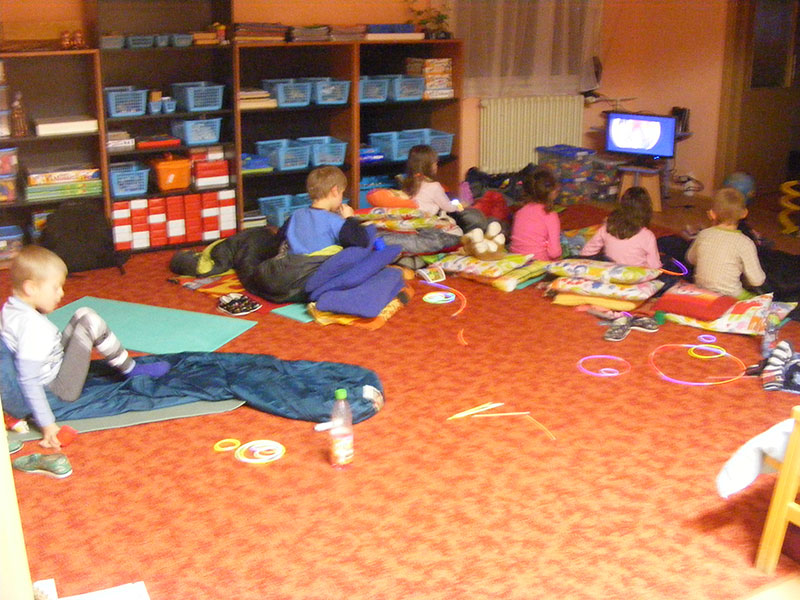 V poslední části tohoto prodlouženého večera jsme společně sledovali pohádku „Polární expres“. Někteří při ní usnuli, jiní vydrželi až do konce, který byl po 22. hodině. Pak už jsme zalezli do spacáků a společně přespali v naší třídě.