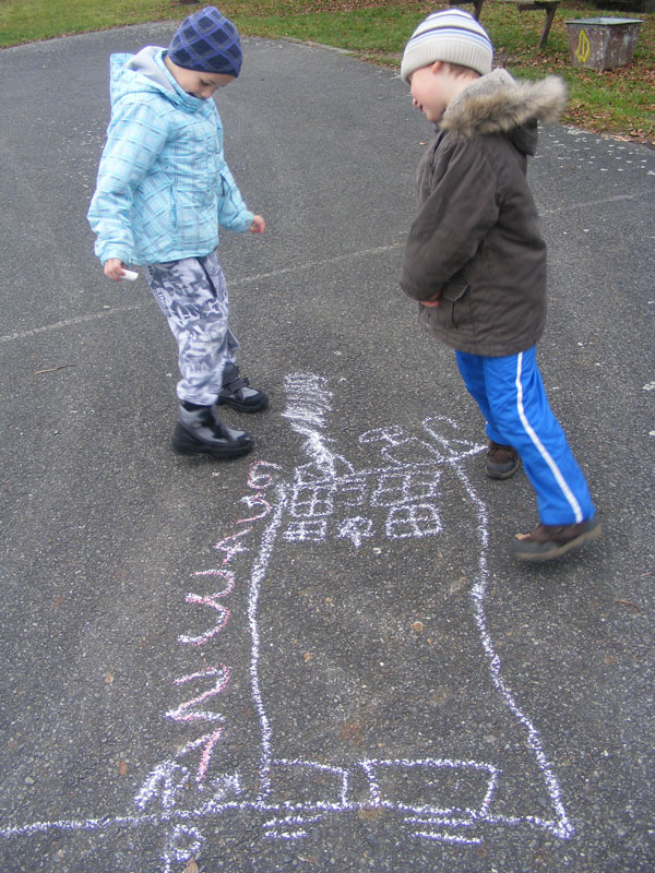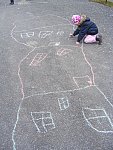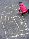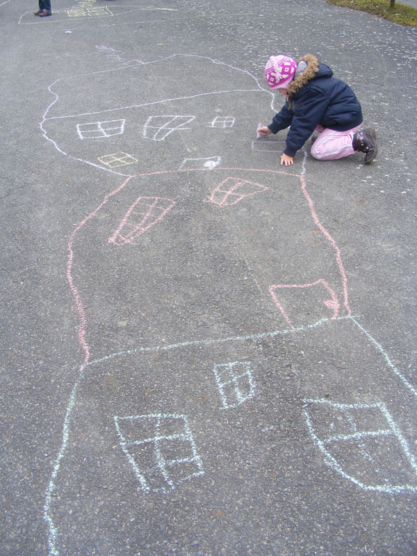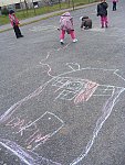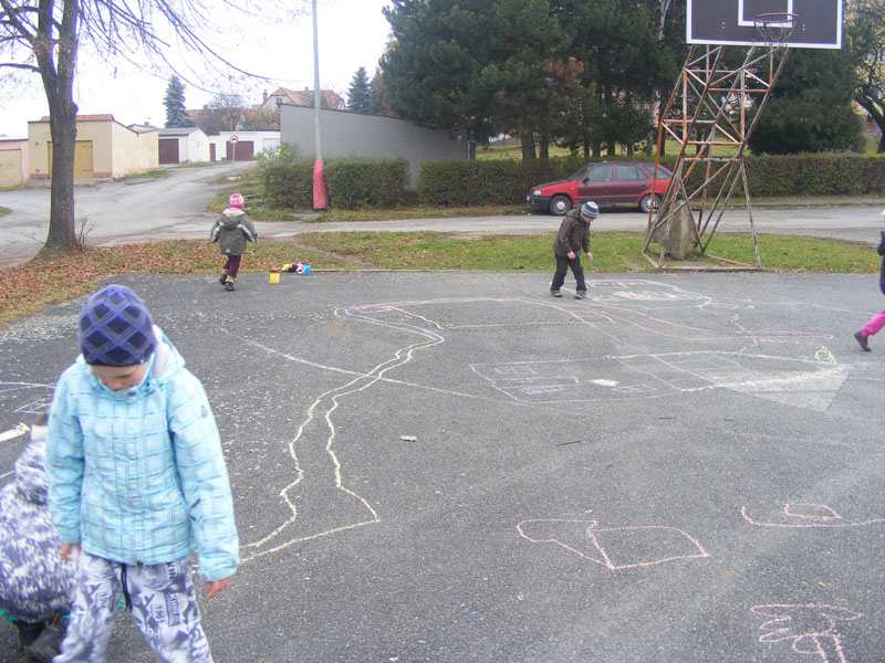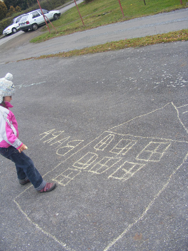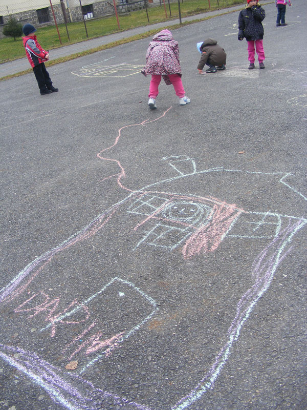 Dům, ve kterém bydlíme, jsme se také vydali nakreslit ven, křídou na asfalt. Když byly domy nakreslené, spojovaly je děti cestami tak, aby mohly chodit ke kamarádům na návštěvu.