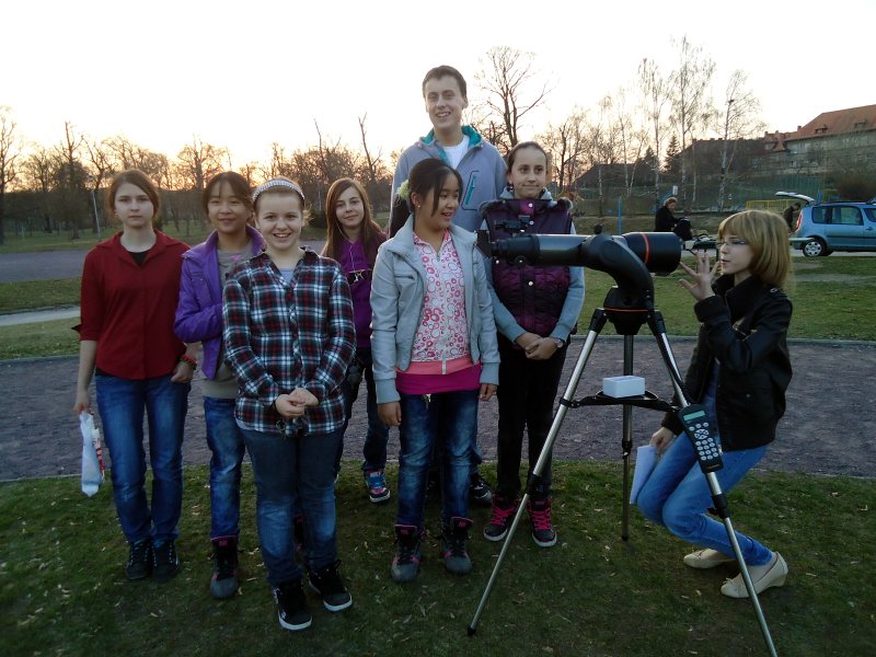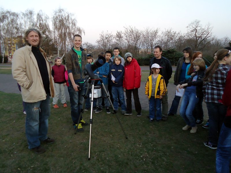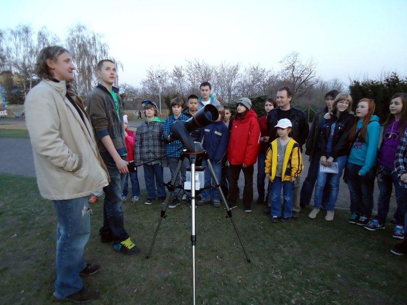 Nejdříve toto pozorování mělo být 12. 3., pak 14. 3., ale nakonec jsme to opět odložili, protože nebylo příliš příznivé počasí. Když všichni dorazili, nikomu to nevadilo, že pozorování bylo odloženo. Řekl bych, že to tomu dodalo i takové větší napětí, co vlastně uvidíme? Nejdříve nám pan Dřevěný popsal všechny nachystané dalekohledy. Jeden byl zrcadlový a dva další čočkové, z nich jeden ovládaný počítačem, který sám vyhledával zadané objekty. Když zapadlo víc slunce, uviděli jsme Venuši a o chvilku později i Jupiter a Mars. Tyto tři planety byly na obloze jako první. Potom jsme viděli v Orionově pásu mlhovinu a kousek od Jupitera hvězdokupu Kuřátka, na kterou nám pan Dřevěný posvítil i laserem. Čím větší byla tma, tím lépe šly všechny objekty vidět. Nakonec nám ukázali některá souhvězdí např. Orion, Býk, Lev, Rak, Blíženci a Velký vůz. Při odchodu jsme poděkovali za zajímavý večer a za strávený čas s námi. Mně se nejvíce líbil Jupiter a jeho čtyři největší měsíce.