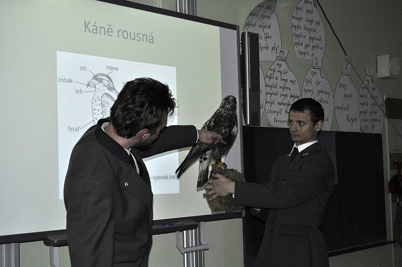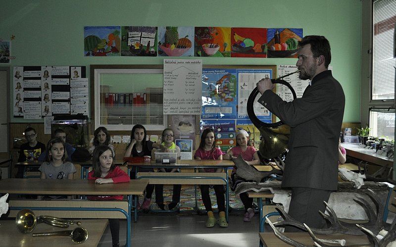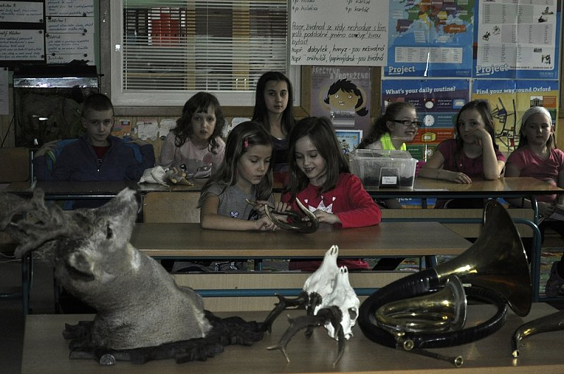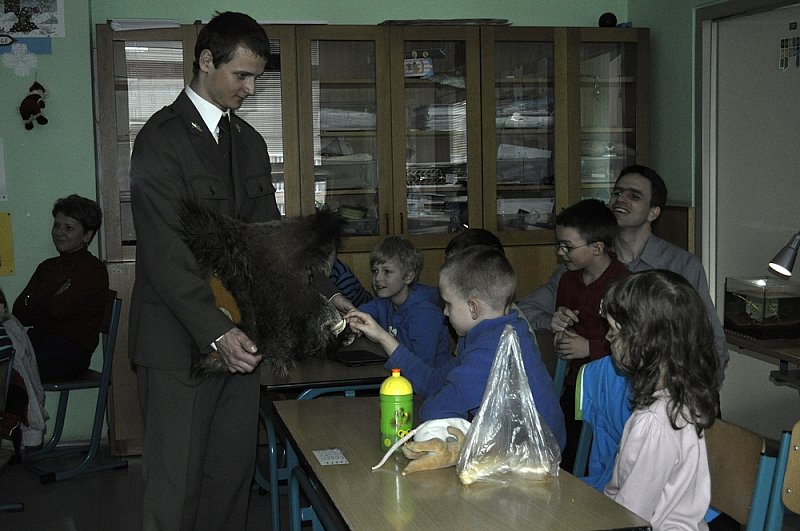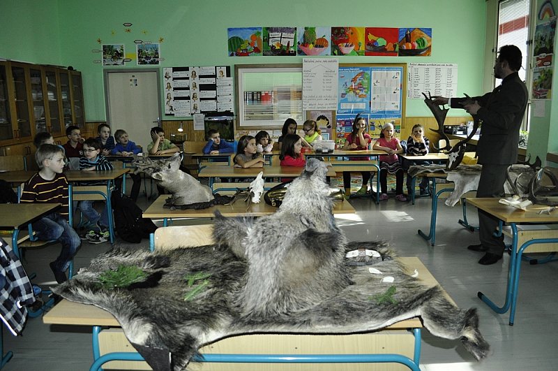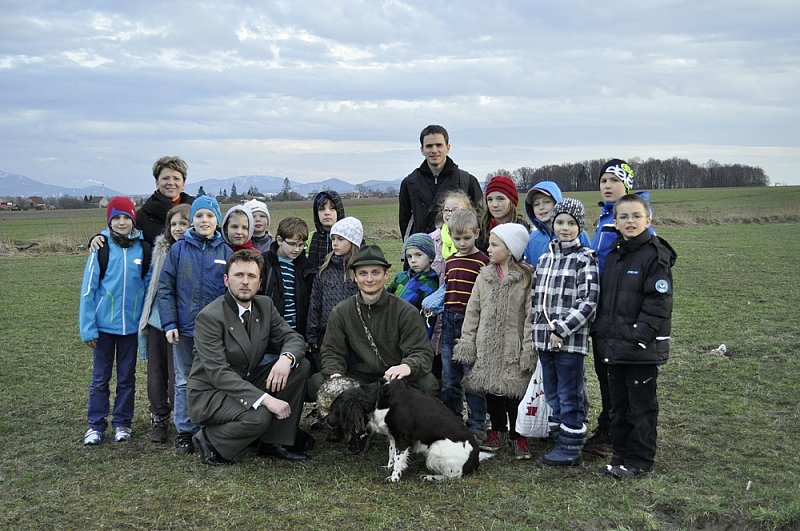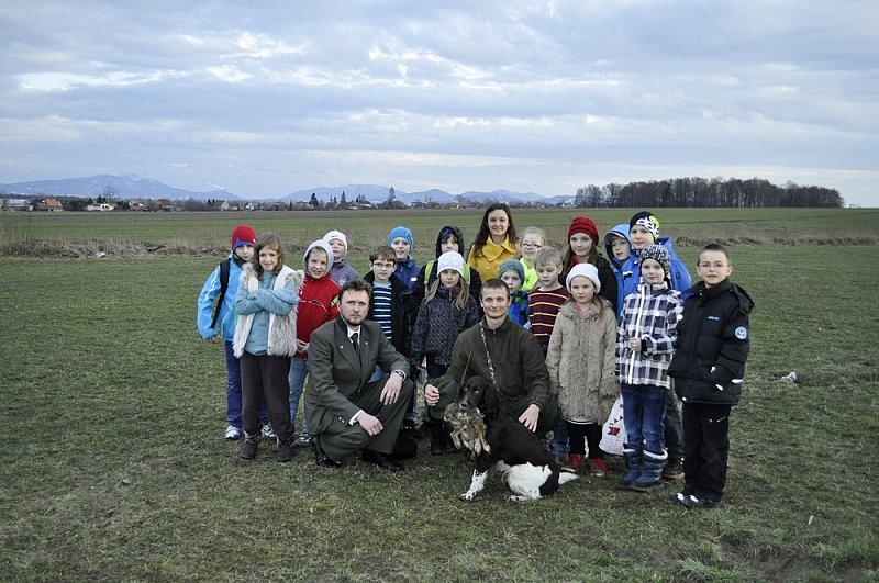 Z okresního mysliveckého spolku k nám přišel pan Karel, který nám poutavě povykládal o myslivosti. Prohlédli jsme si zvířecí trofeje, dověděli se něco o životě lesních zvířat, poslechli myslivecké halali i shlédli práci loveckého psa na poli. Beseda se nám velmi líbila, a tak myslivec Karel přislíbil, že udělá v příštím roce ještě jednu, tentokrát přímo v honitbě.