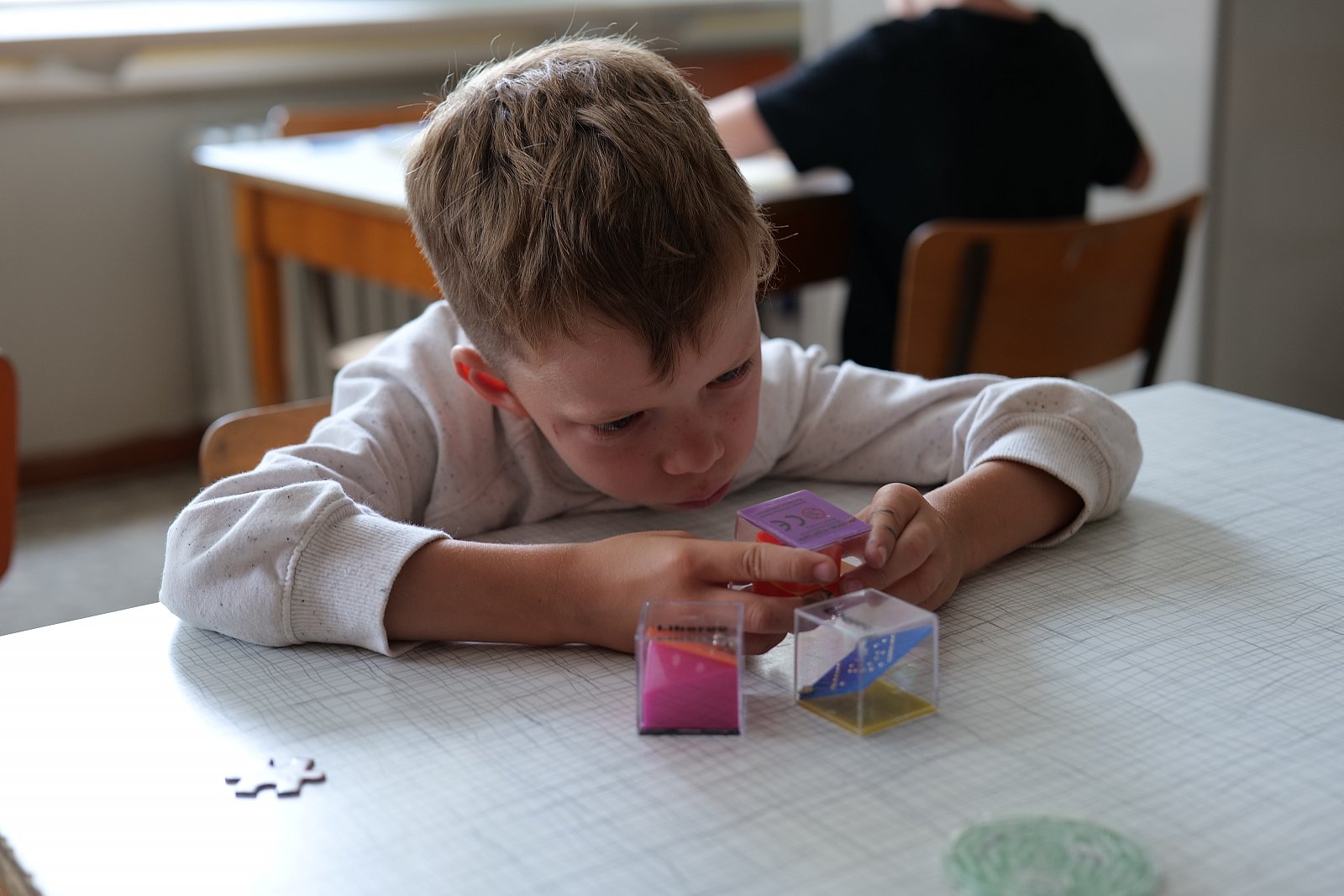 První setkání klubu jsme zahájili seznamováním všech dvanácti dětí a dvou paní učitelek. Pak jsme se vrhli na ochutnávky nejrůznějších činností, které nás v klubu budou čekat. Za každý splněný úkol, vyluštěnou šifru, či zvládnutý hlavolam si děti braly jeden dílek puzzle. Když dílky došly, společnými silami z nich poskládali obrázek. Na zadní straně pak děti našly zašifrovaný vzkaz. Byl to úkol do příště – přijít s návrhem názvu pro náš KND. A tak se nám po 14 dnech sešla řada návrhů. Hlasování bylo vyrovnané a do pomyslného finále se dostaly dva názvy – Talentík a Sovičky. Poradili jsme se s chatem GPT, který nás inspiroval k tomu, abychom si sovičku vzali jako maskota a rovnou nám i pomohl s vytvořením jeho obrázku, který nyní používáme jako logo. Abychom využili AI maximálně, zadali jsme vlastní text ke klubové písničce do SUNO.com a tak už máme i svůj klubový „song” o nadaných dětěch.