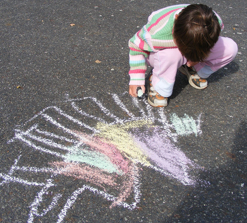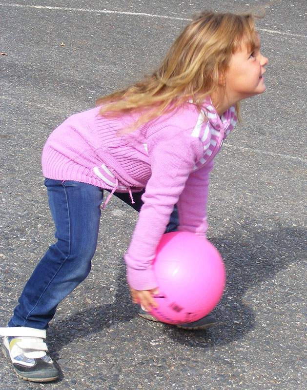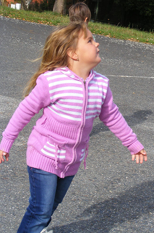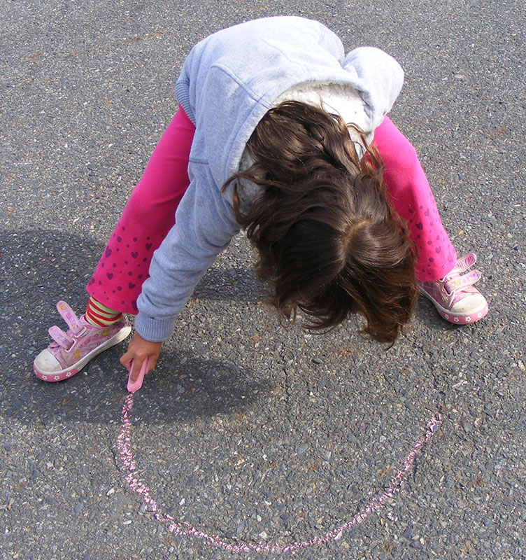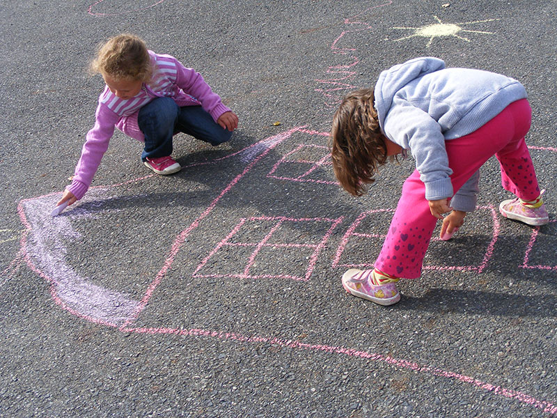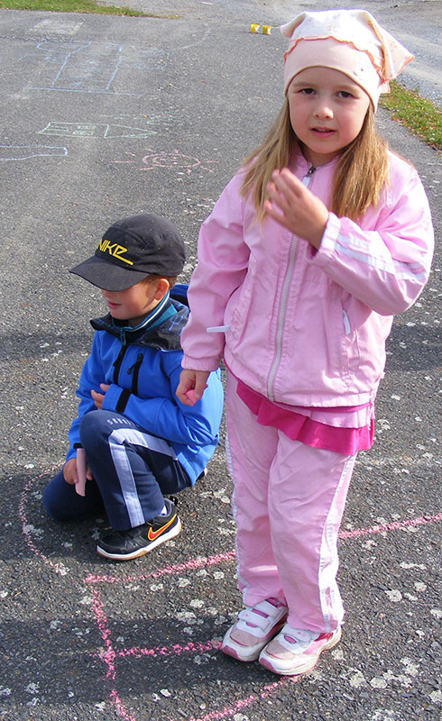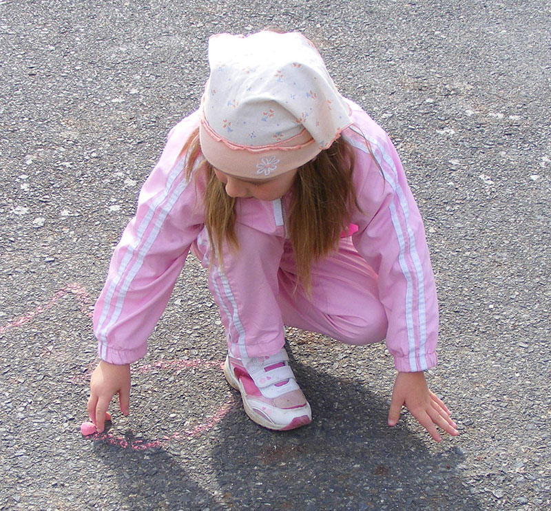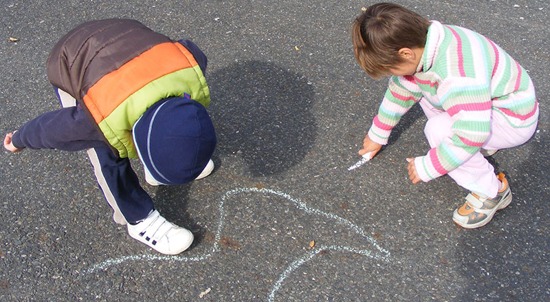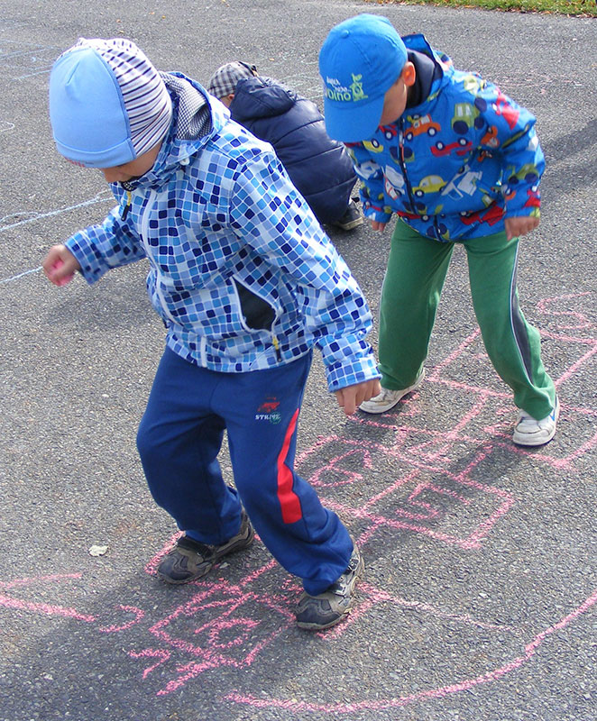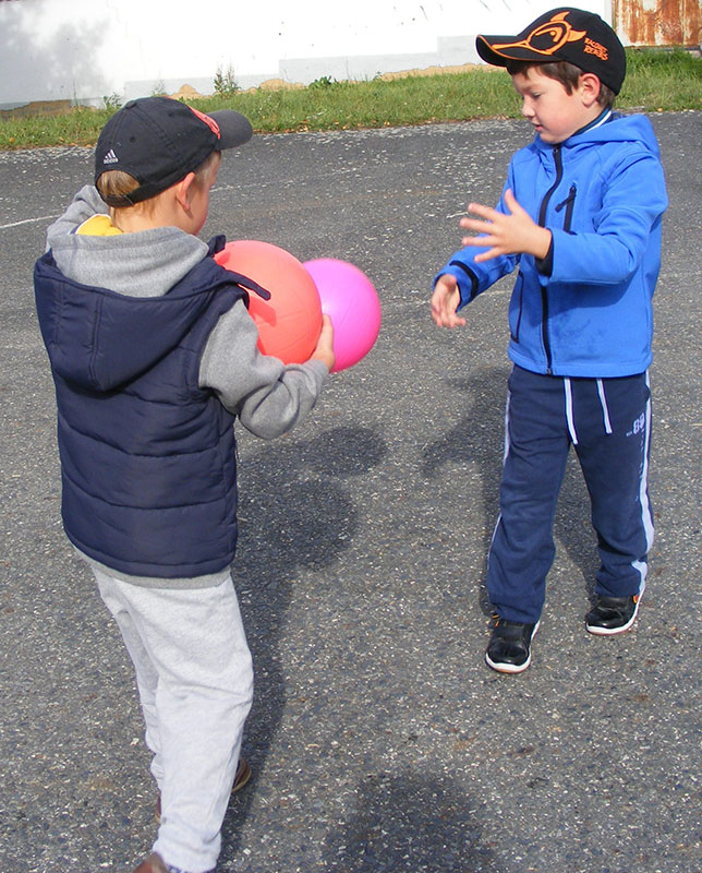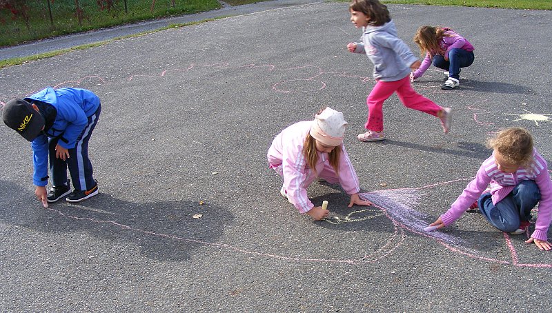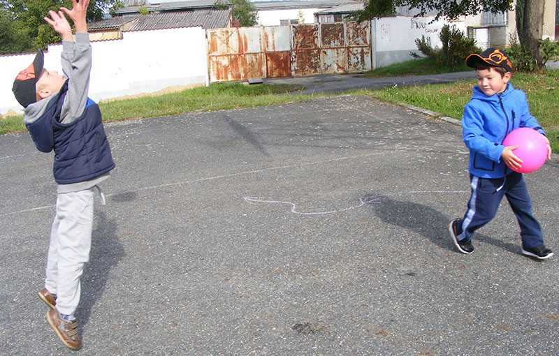 V pěkném počasí využíváme otevřené basketbalové hříště, kam chodíme kreslit křídami, čímž posilujeme grafomotoriku, a hrát si s míči, což je jedním z prvků NTC systému učení.