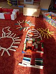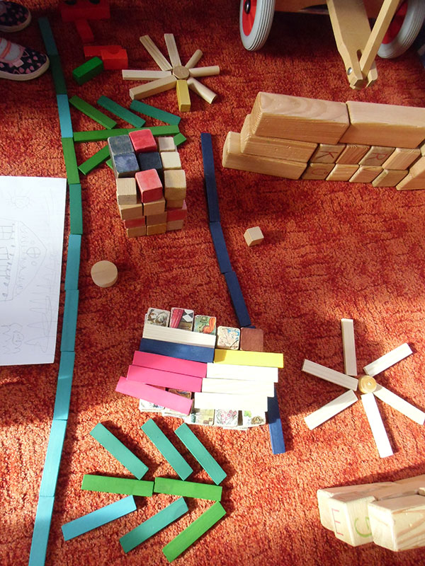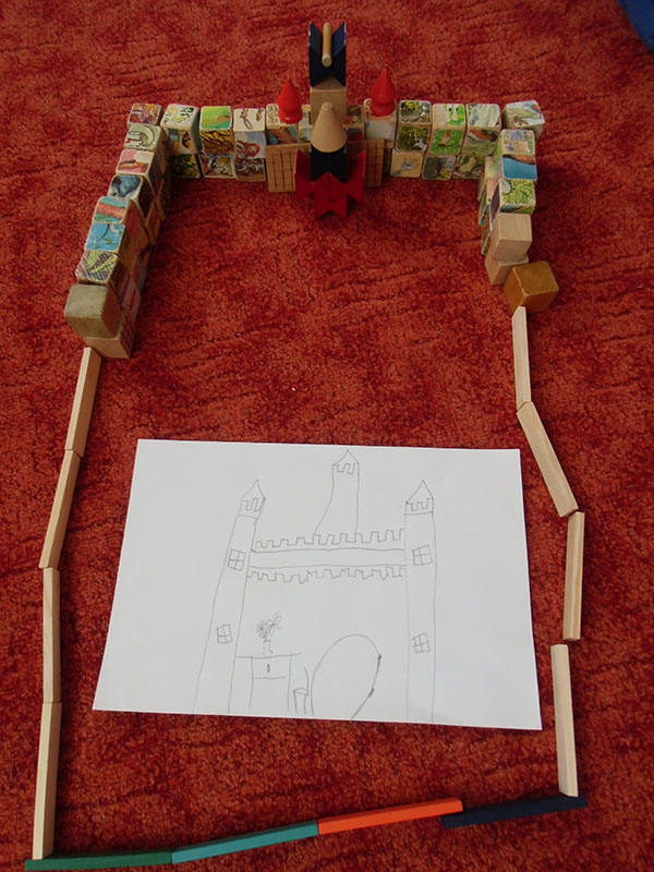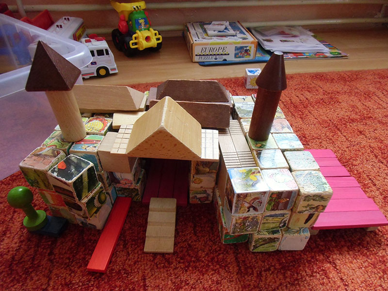 Třídili jsme kartičky s vyobrazením bytového zařízení podle toho, kde je najdeme a porovnávali množství, kterých kartiček je nejvíce, nejméně apod. Následně jsme ve dvojicích kreslili obyčejnou tužkou plánek jako předlohu stavby domu z kostek, který jsme pak opět ve dvojicích stavěli.