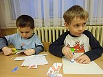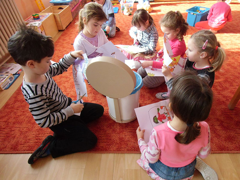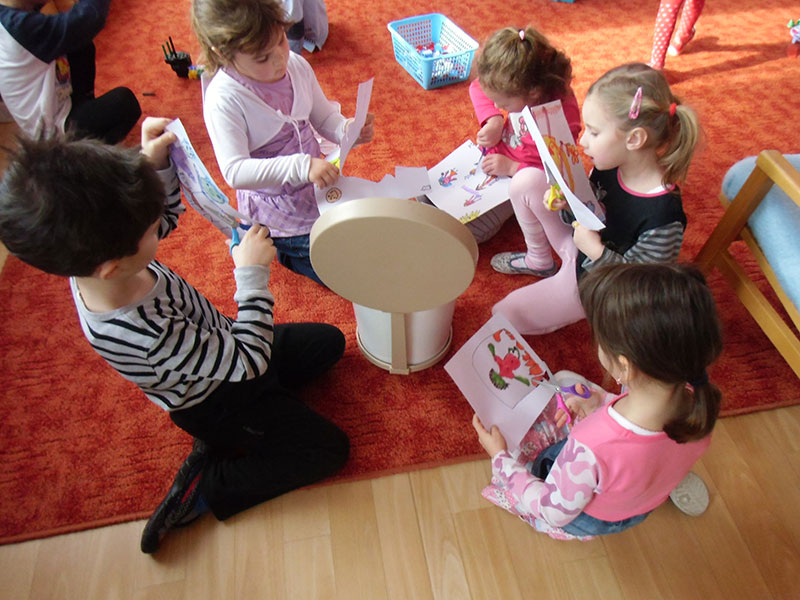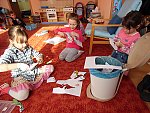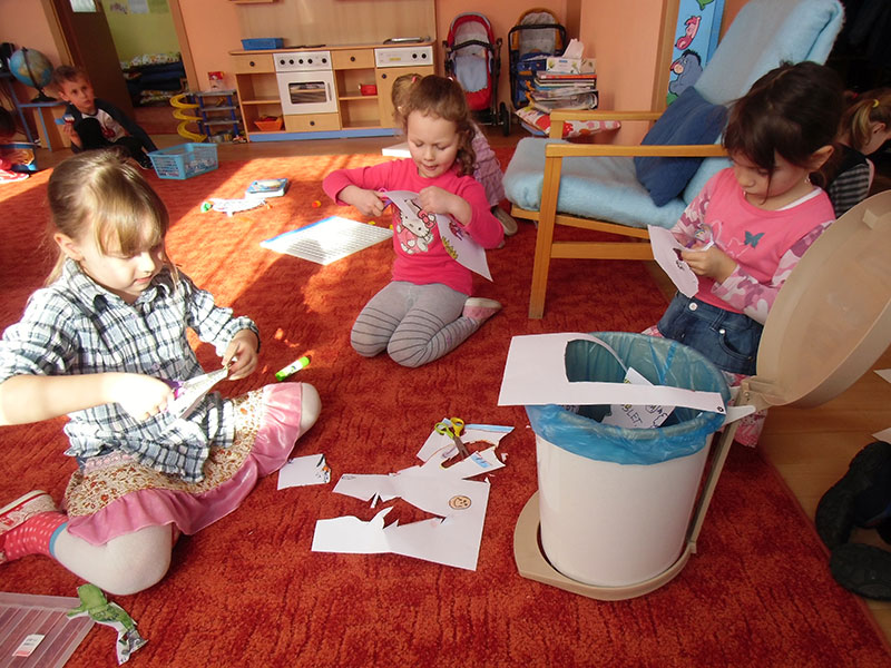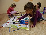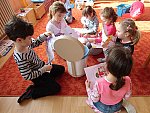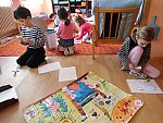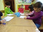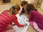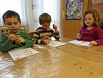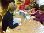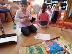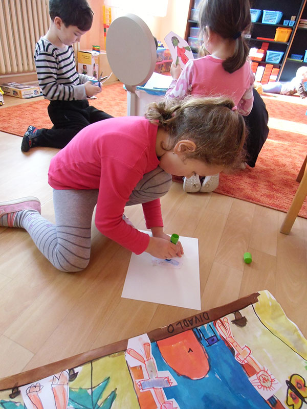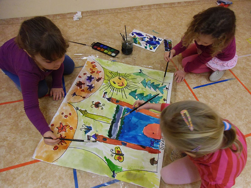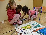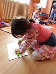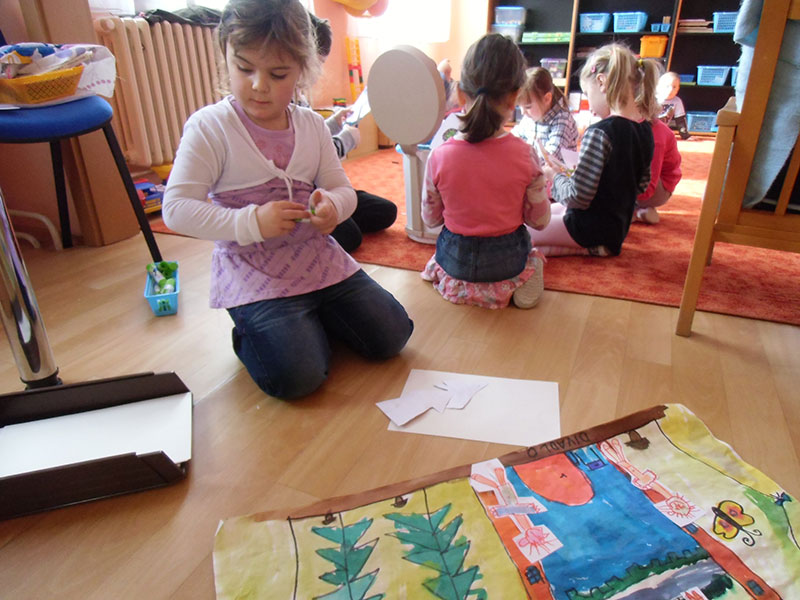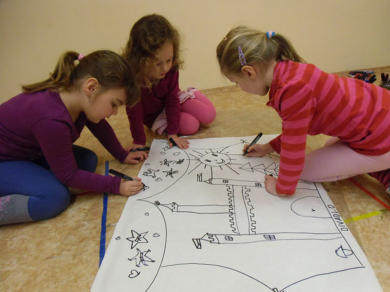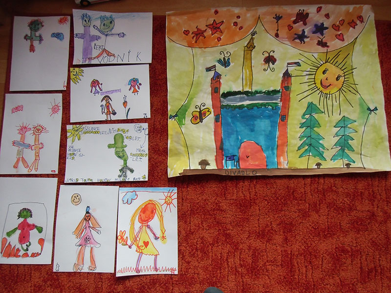 Děti si pak volně hrály s tímto divadélkem v průběhu ranních her. Podle kulis v divadle pak nakreslily lihovou fixou a kolorovaly anilinovými barvami na velký balící papír divadelní scénu, kam následně nalepovaly loutky, které si nakreslily a vystříhaly z papírových čtvrtek.