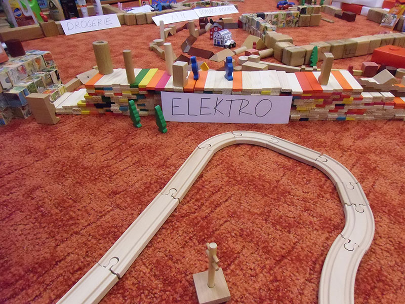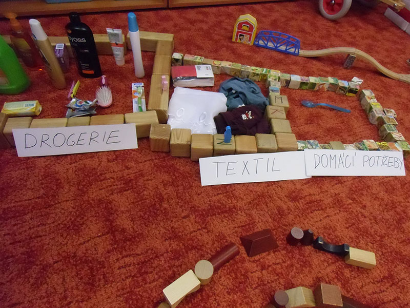 V týdnu, kdy jsme si povídali o tom, jaké máme ve městě obchody, si děti nosily do MŠ různé druhy zboží. Tyto jsme pak následně třídili dle toho, v jakém obchodě se kupují. Společně pak děti z kostek postavily město s těmito obchody a následně kreslily obyčejnou tužkou plán města s obchody.