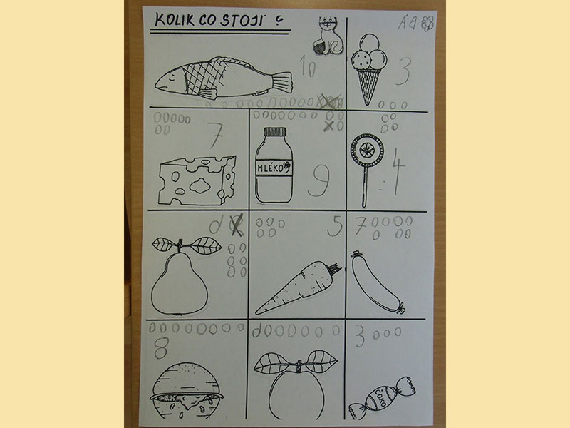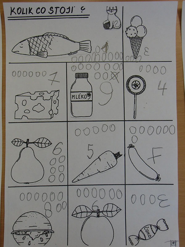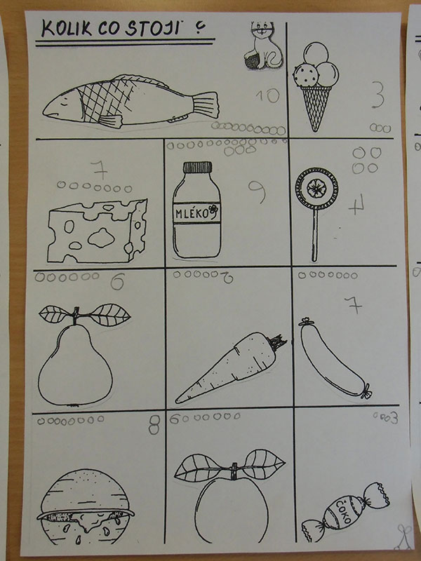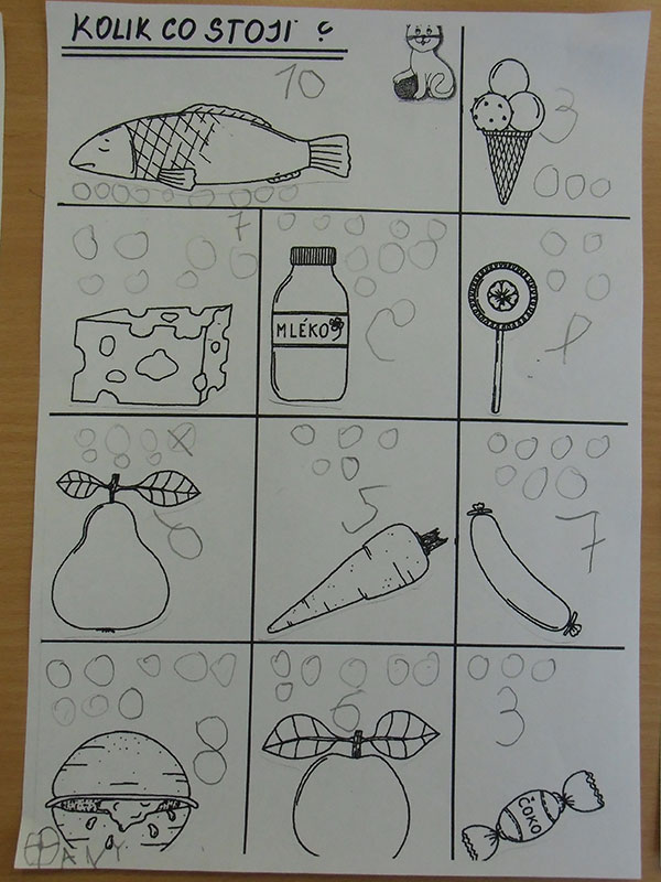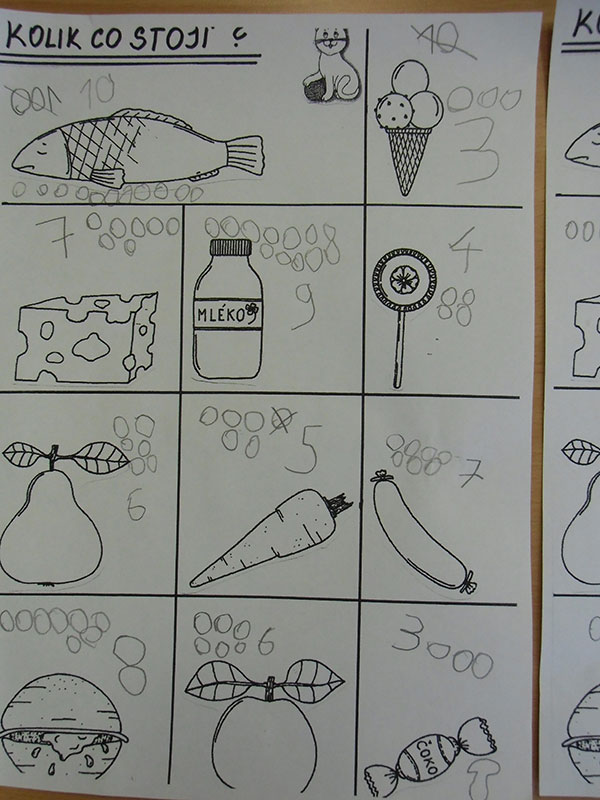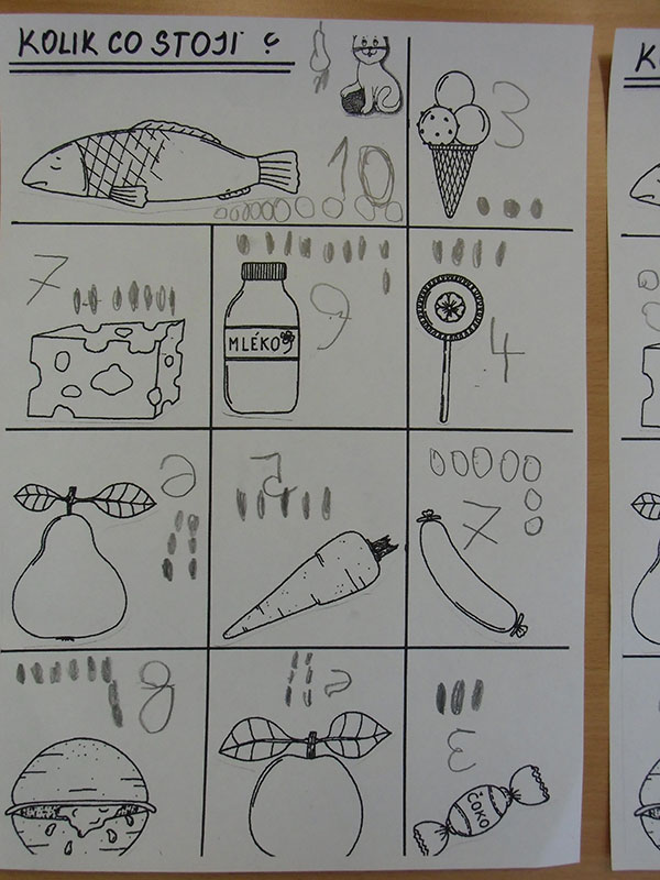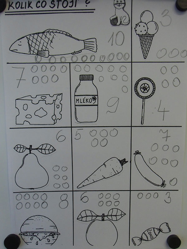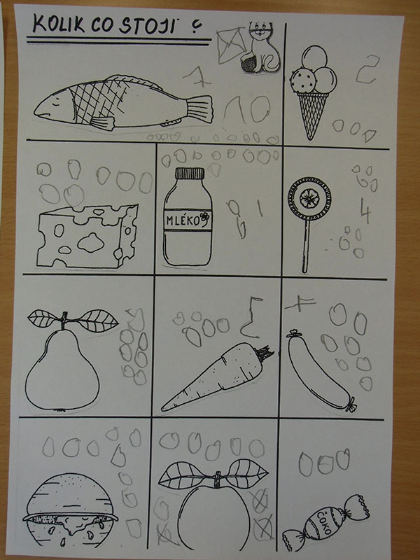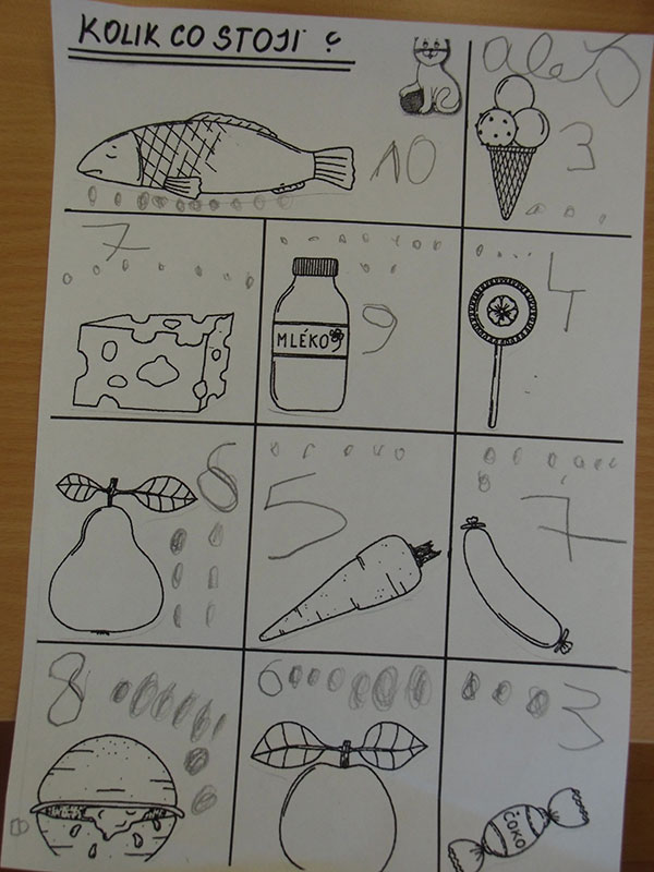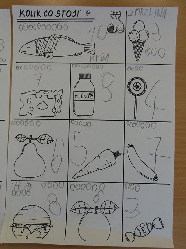 Cílem této aktivity, kdy jsme si hráli na nakupování, bylo zaznamenat dle slovních pokynů učitelky, kolik peněz zaplatíme za určené potraviny.