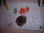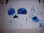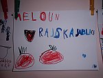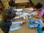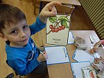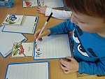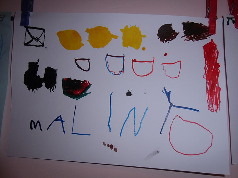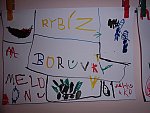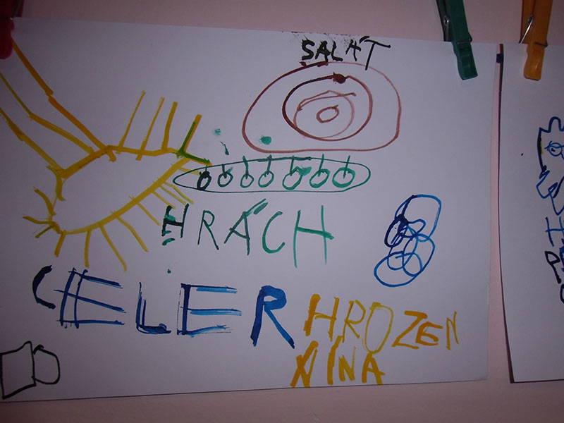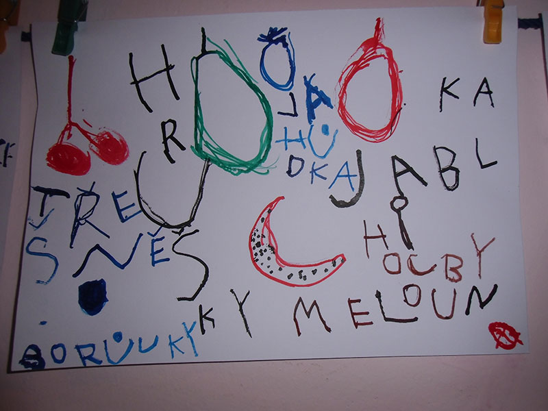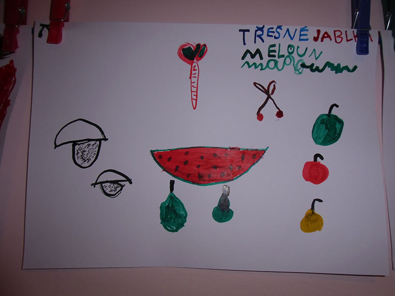 Když bylo vše roztříděno, „četly“ děti shora dolů, ve sloupci, jak šly jednotlivé druhy za sebou a zároveň rytmizovaly hrou na tělo. V závěru pak kreslily špejlí namáčenou v barevné tuši ovoce a zeleninu dle obrázkových karet; kdo chtěl, opisoval také jejich názvy.