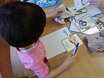 Dopolední aktivity vztahující se k ovoci a zelenině jsme začali tím, že jsme „vozili“ zboží do odpovídajícího obchodu – zelenina zvlášť, ovoce zvlášť. Děti rozdělovaly obrázky a kartičky do příslušných skupin a zároveň pod ně skládaly jejich název rozstříhaný dle slabik.