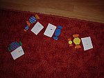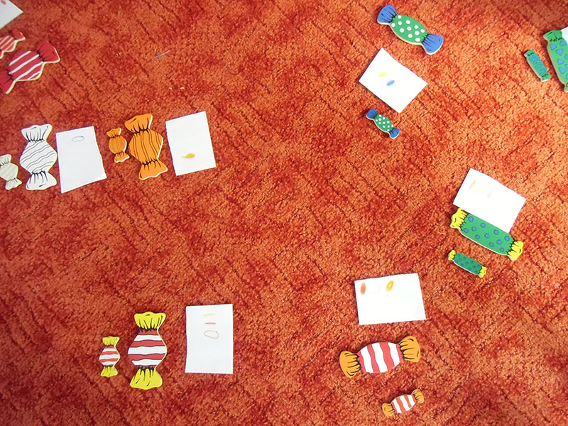 Nejprve jsme si společně vysvětlili, jak lze na papírové kartičky zaznamenat odpovídající barvy, které budou mít konkrétní skupiny. Následně děti samy vybíraly barevné bonbóny a přiřazovaly je ke kartičkám, na které barevnými puntíky vyznačily barvy odpovídající dané skupině bonbónů.