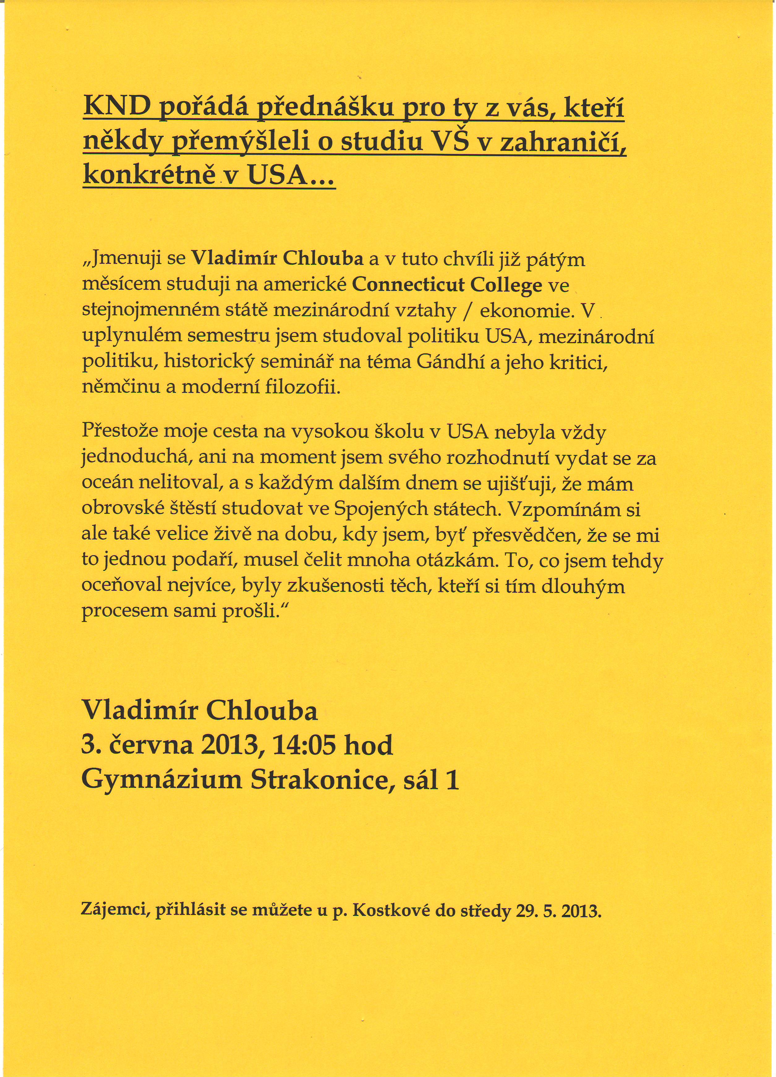 „Jmenuji se Vladimír Chlouba a v tuto chvíli již pátým měsícem studuji na americké Connecticut College ve stejnojmenném státě mezinárodní vztahy / ekonomie. V uplynulém semestru jsem studoval politiku USA, mezinárodní politiku, historický seminář na téma Gándhí a jeho kritici, němčinu a moderní filozofii.