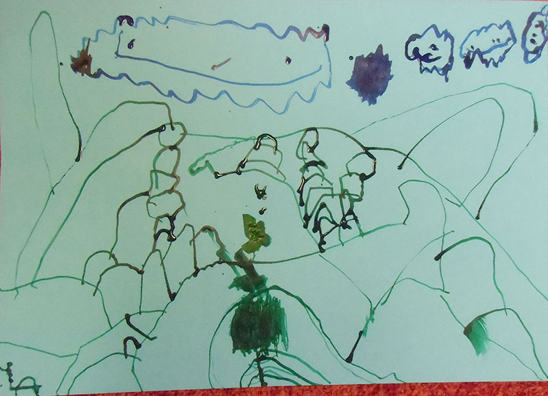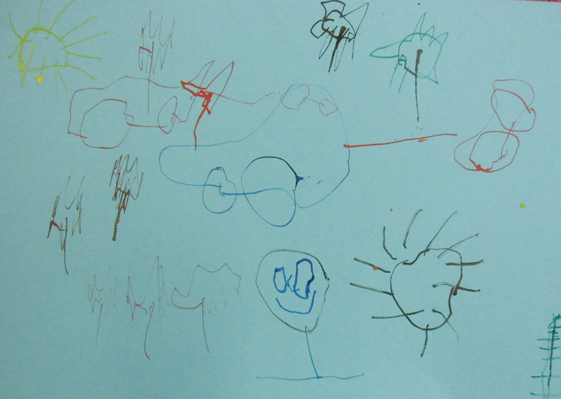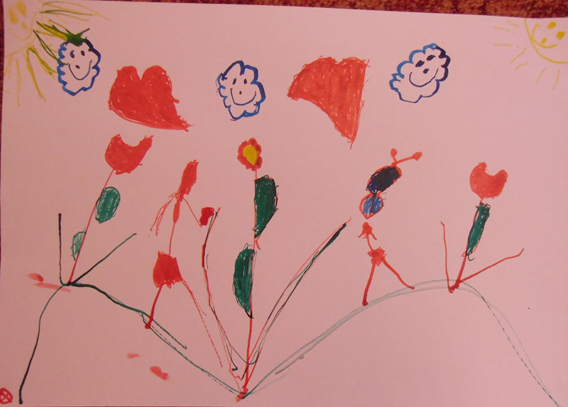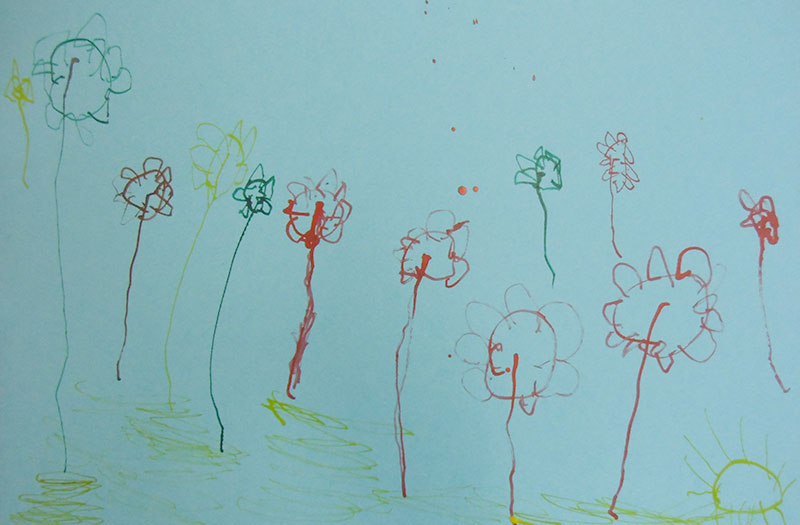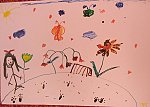 V této aktivitě jsme procvičovali jemnou motoriku. V úvodní motivační části jsme si přečetli příběh o tom, jak se na jaře čáp vrátil z teplých krajů a pak si děti prohlížely ve skupinách encyklopedie s květinami. V kruhu za doprovodu motivační říkanky jsme prováděli grafomotorická cvičení, krouživé pohyby zápěstí, vybarvování sluníčka, dlouhé rovné čáry, paprsky sluníčka a krátké čáry, dokreslení pampelišek. Zahradu s jarními květy jsme následně kreslili špejlí namáčenou v barevných tuších.