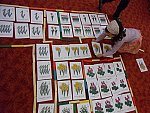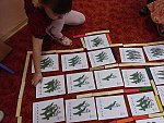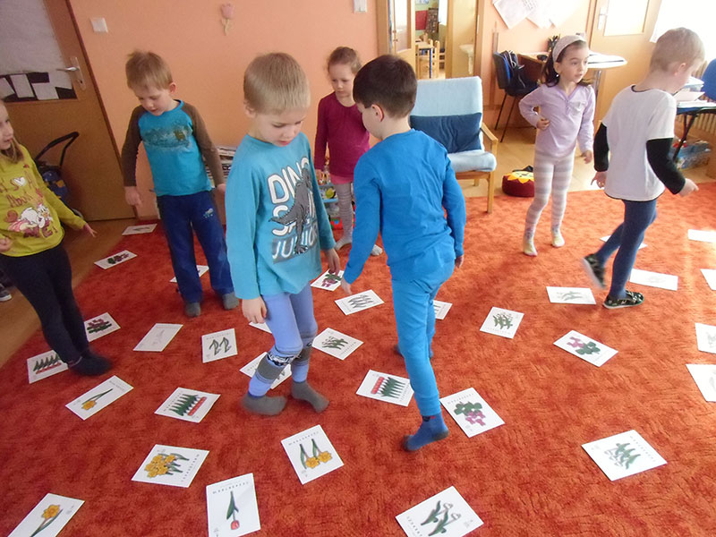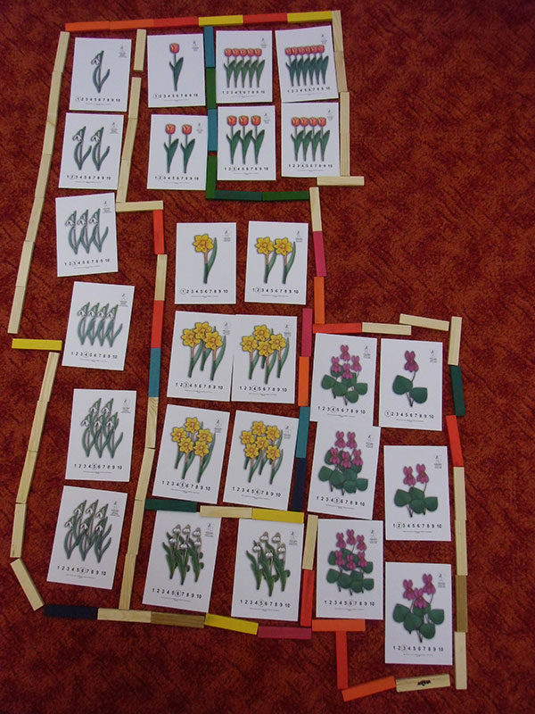 Obrázky květin byly volně rozložené v prostoru třídy na koberci. Děti z nich dle pokynů učitelky vytvářely záhonky, vždy odpovídající druh, od nejnižšího počtu do nejvyššího. Třídění dle druhu pak prováděly děti volně při vytváření zahradnictví s využitím kapla kostek, kterými oddělovaly jednotlivé záhonky s určitým druhem květin. S prvky kombinatoriky jsme pracovali, při společném vytváření záhonků, tak, aby od každého druhu květin byl jeden zástupce, nicméně vždy v jiném postavení v řadě. Hrou „pohni a vyměň“ jsme pak cvičili paměť: na koberci v kruhu před dětmi byly rozloženy obrázky květin, z nichž vždy konkrétní dítě jednu vyměnilo a druhou pohnulo, zatímco ostatní děti měly zavřené oči. Po otevření očí zjišťovaly, co se na koberci změnilo.