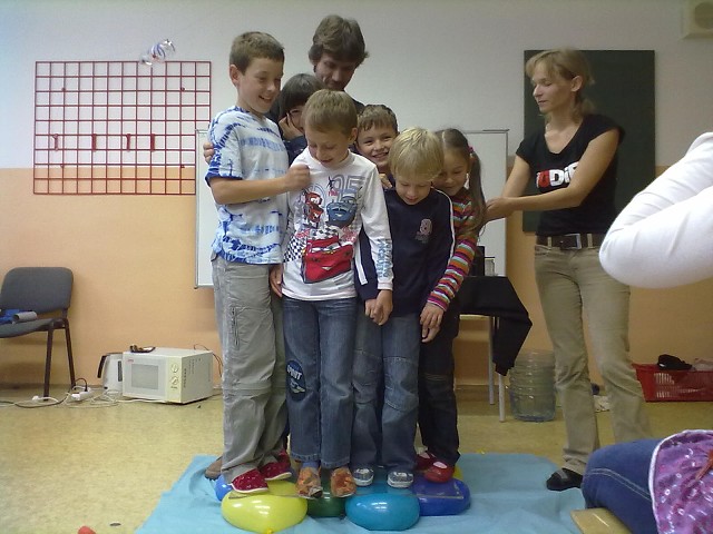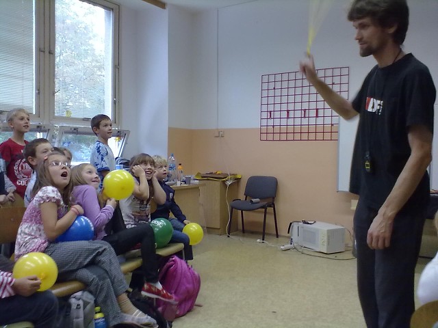 Na úvodní schůzku jsme pozvali ÚDiF - Úžasné divadlo fyziky. Jejich představení probíhalo na ZŠ Salmova celý den. Vystřídali se žáci 7.-9. tříd a poslední představení bylo určeno právě vybraným dětem z 2.-6. tříd - členům Klubu nadaných dětí.
