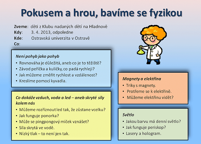 Zveme děti z Klubu nadaných dětí na Hladnově, aby odpoledne 3. dubna 2013 přišly na katedru fyziky Přírodovědecké fakulty Ostravské univerzity v Ostravě.