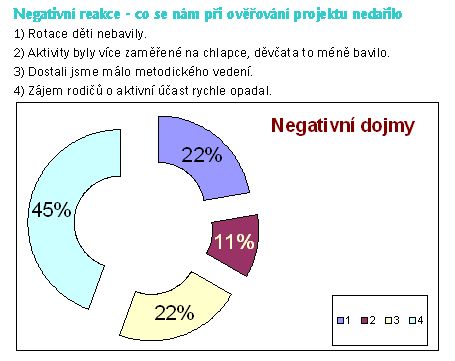 Měli bychom se na tomto místě také zmínit o nepříznivých výstupech. Učitelky nám v rámci celkové evaluace v dotaznících také dobře poukázaly na mírné nedostatky zapojení do projektu, které jsou pro nás odrazovým můstkem pro další zlepšování. Některé ze zmiňovaých oblastí nám byly dopředu zřejmé. Např. fakt, že jsme dali málo instrukcí k metodickému zapojení aktivit do výuky. Tuto záležitost bychom však rádi vylepšovali ve druhé fázi projektu a rádi bychom se také lépe připravili na spolupráci s rodiči, kterým nestačí pro kontinuální spolupráci jen vstupní zaučení do používání aktivit s dětmi. I oni potřebují podpůrné vedení a sem-tam nějakou zajímavou akci, kde by mohli načerpat nové nápady. O čtyřech nejpalčivějších oblastech zapojení do projektu svědčí Obr. 4.