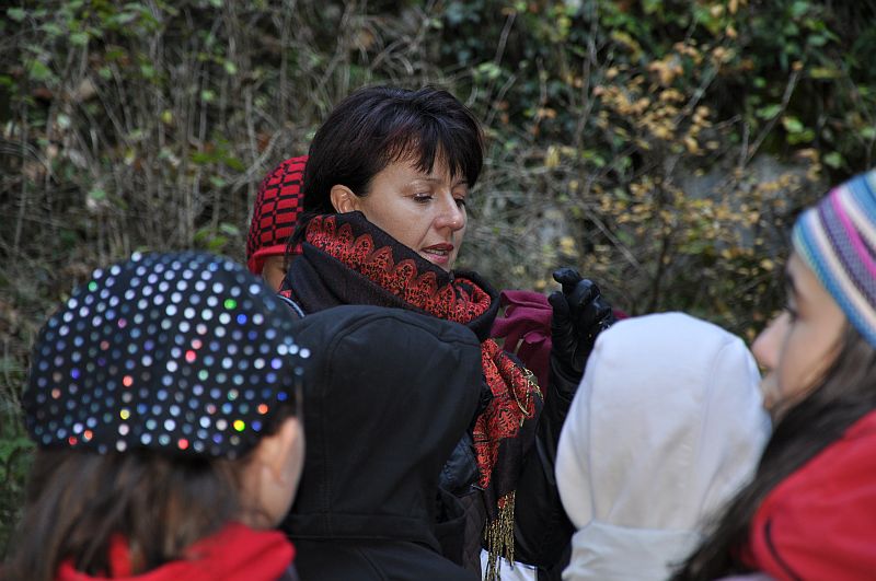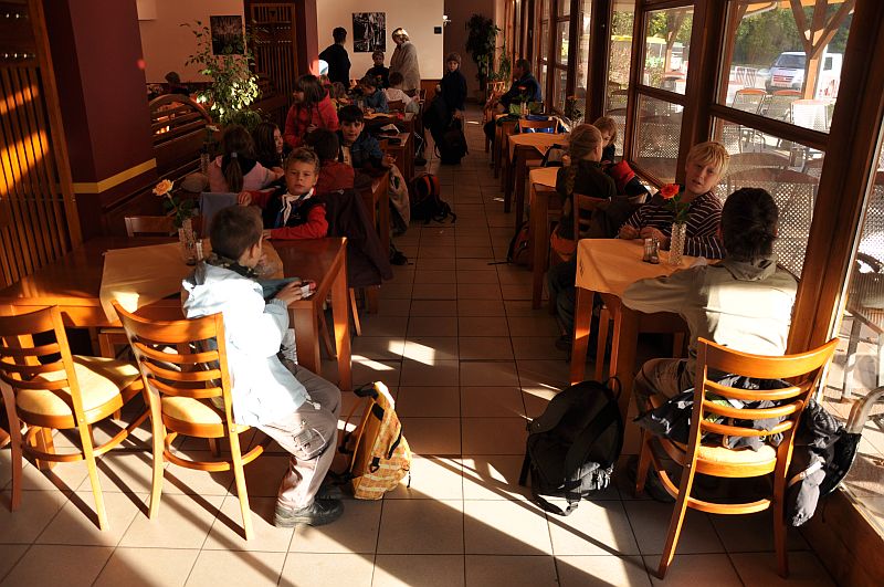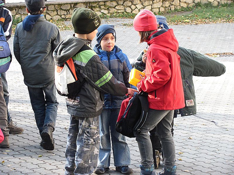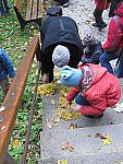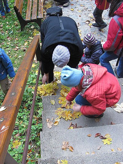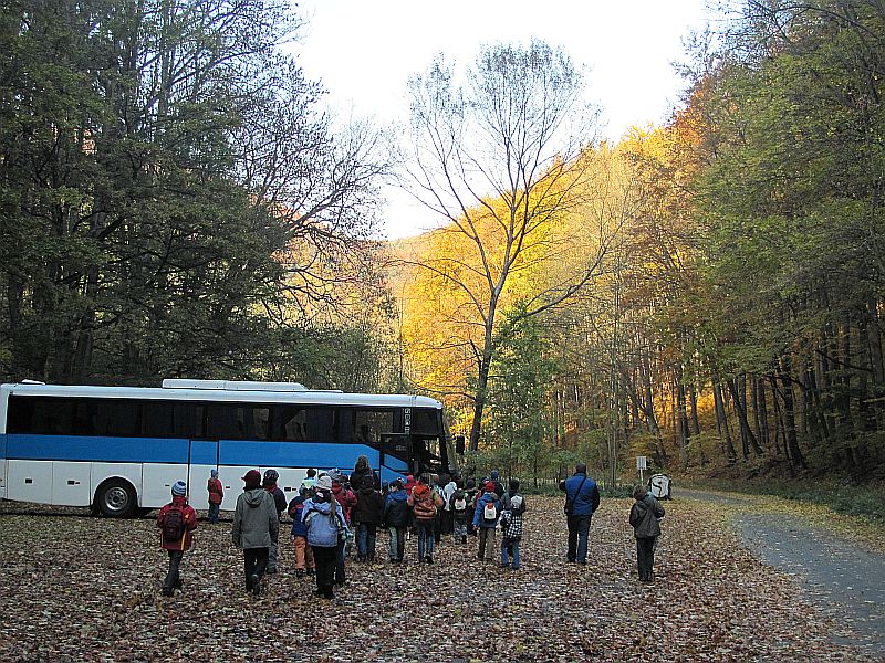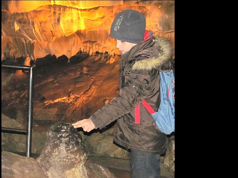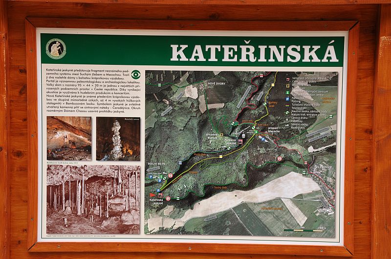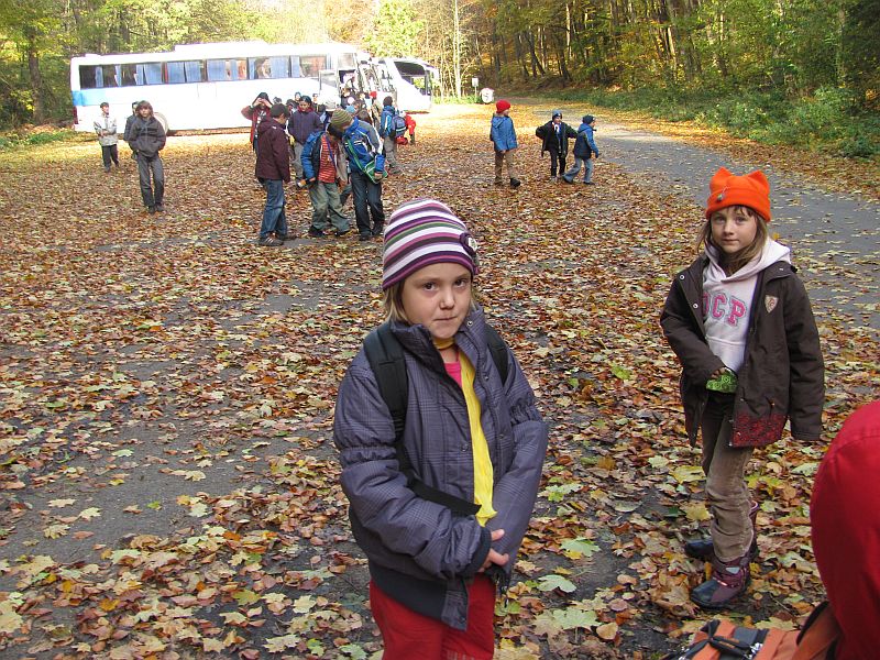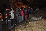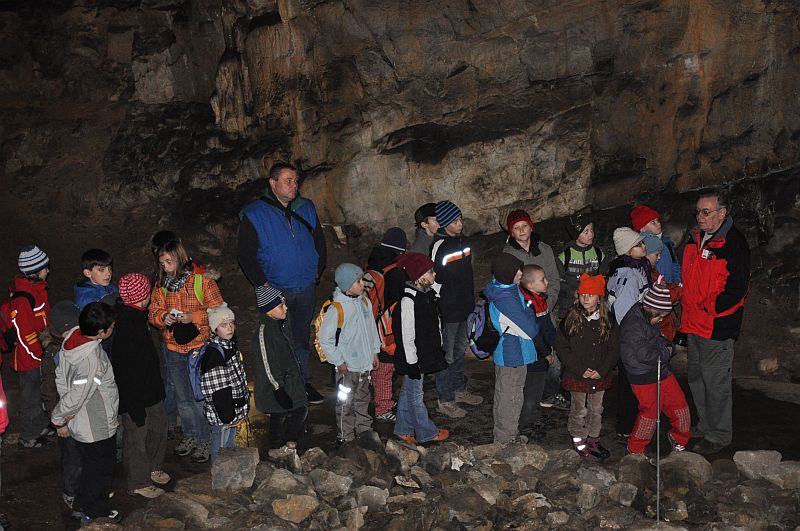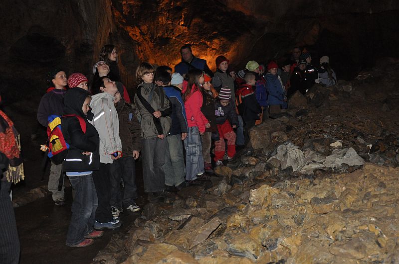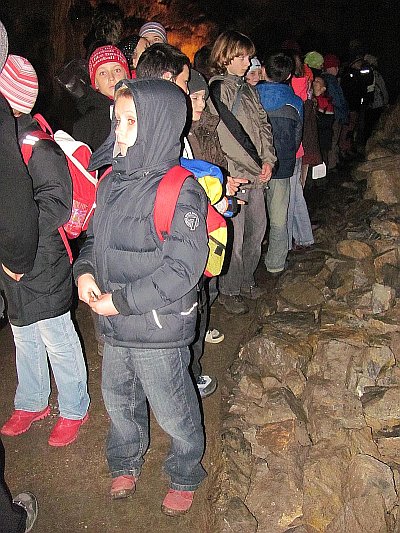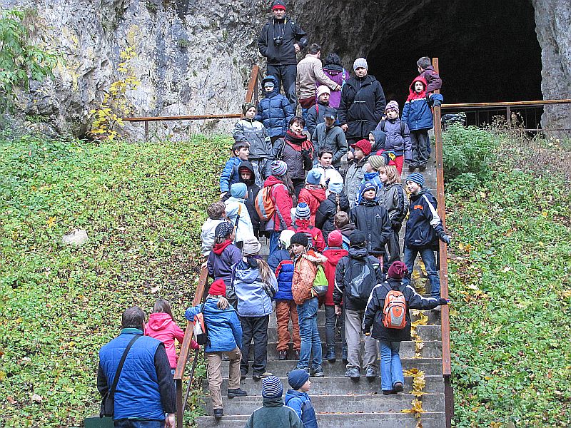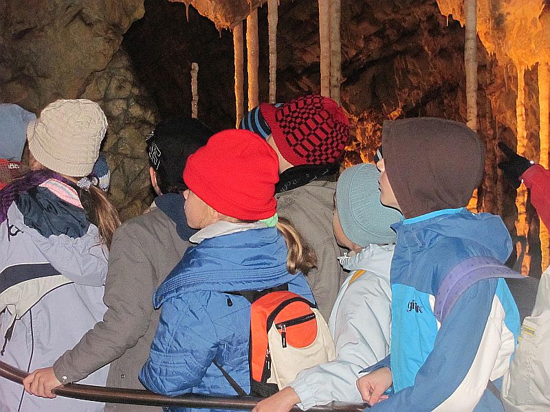 Pak už se všech 37 dětí a jejich doprovod vydalo na prohlídku Kateřinské jeskyně. Kateřinskou jeskyni nyní obklopují v Suchém žlebu husté barevně zbarvené lesy. Jeskyni tvoří dva vzájemně spojené mohutné dómy s přilehlými chodbami. V částech bližších vchodu sídlil člověk starší doby kamenné, jehož pozůstatky byly nalezeny v jeskynních hlínách vedle kostí čtvrtohorních zvířat, zejména medvědů (unikátní je hromadný nález koster jeskynních medvědů v jednom z komínů jeskyně). Zažili jsme pravou jeskynní tmu, zazpívali si v koncertním dómu a pokochali se krásnou krápníkovou výzdobou. Mezi nejkrásnější partie patří barevně nasvícený útvar Čarodějnice a Bambusový lesík tvořený vzácnými, několik metrů vysokými hůlkovými stalagmity.