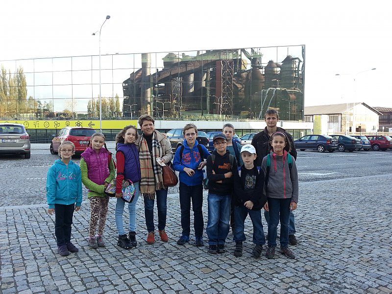 ![]() Společné foto před budovou "Velkého světa techniky" |