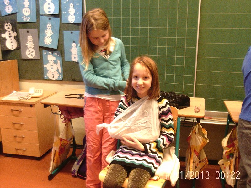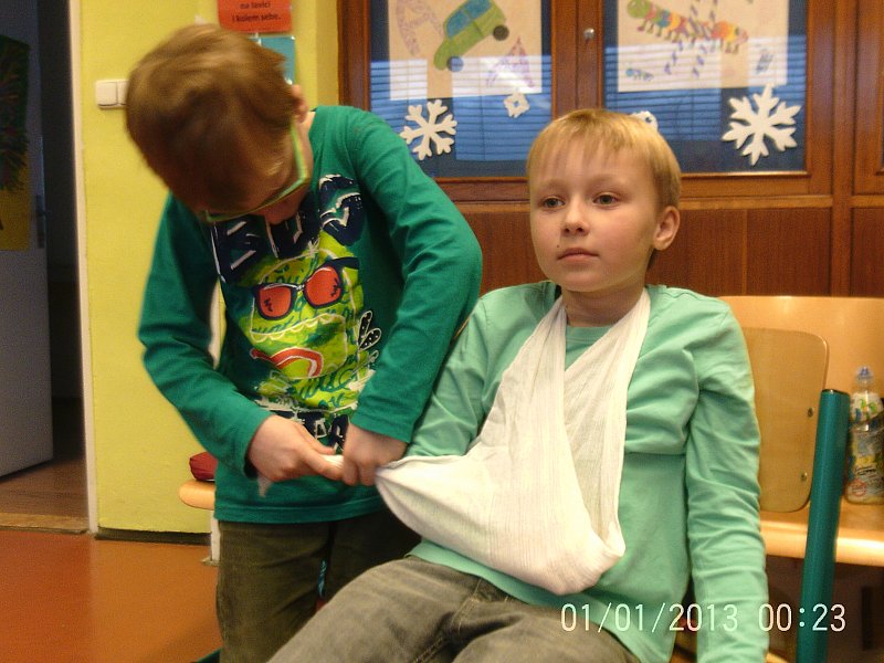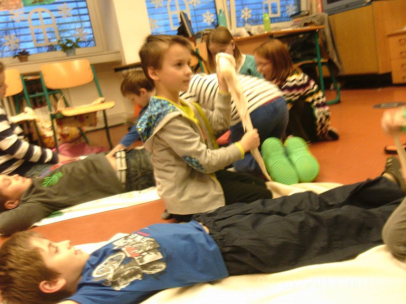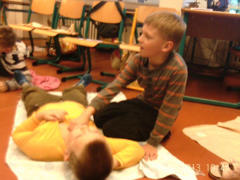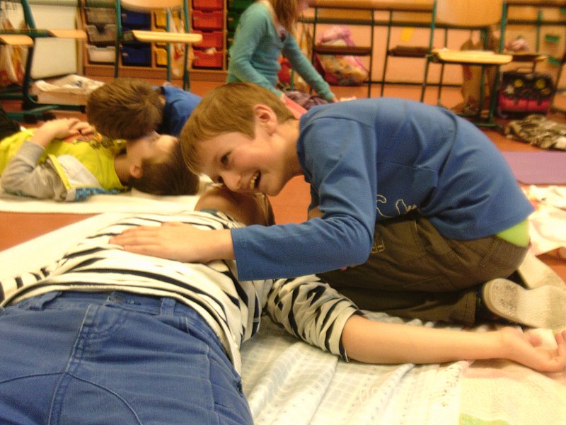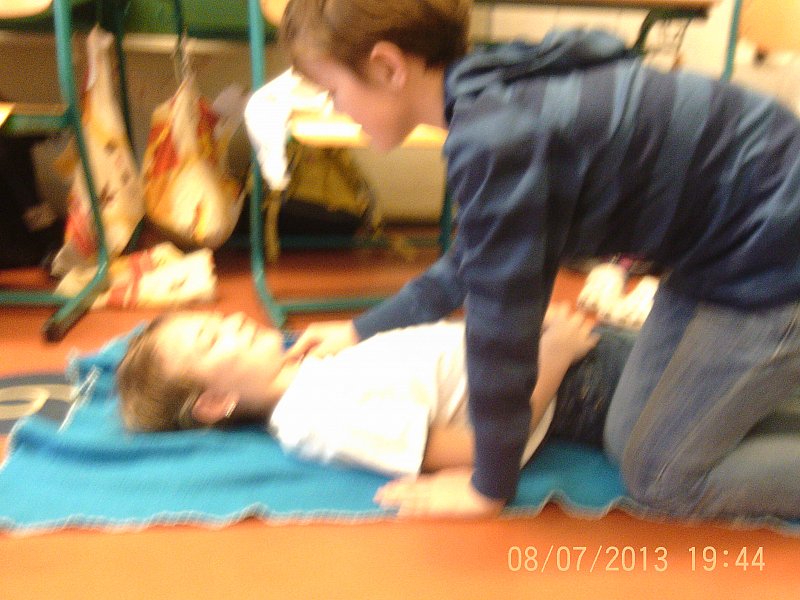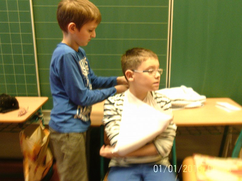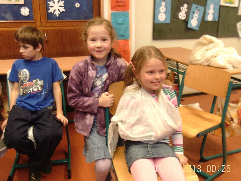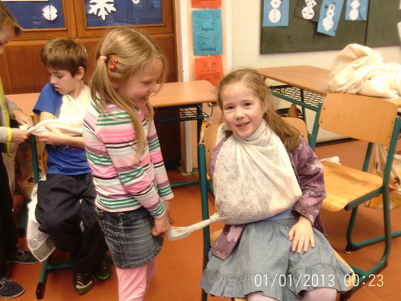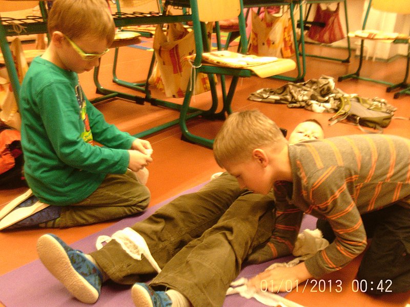Děti si vyzkoušely spčítat svou dechovou frekvenci, změřit si tep, Na kamarádovi zjistit, zda dýchá, změřit mu tep, ošetřit krvácení z nosu, zafixovat zlomenou horní i dolní končetinu.