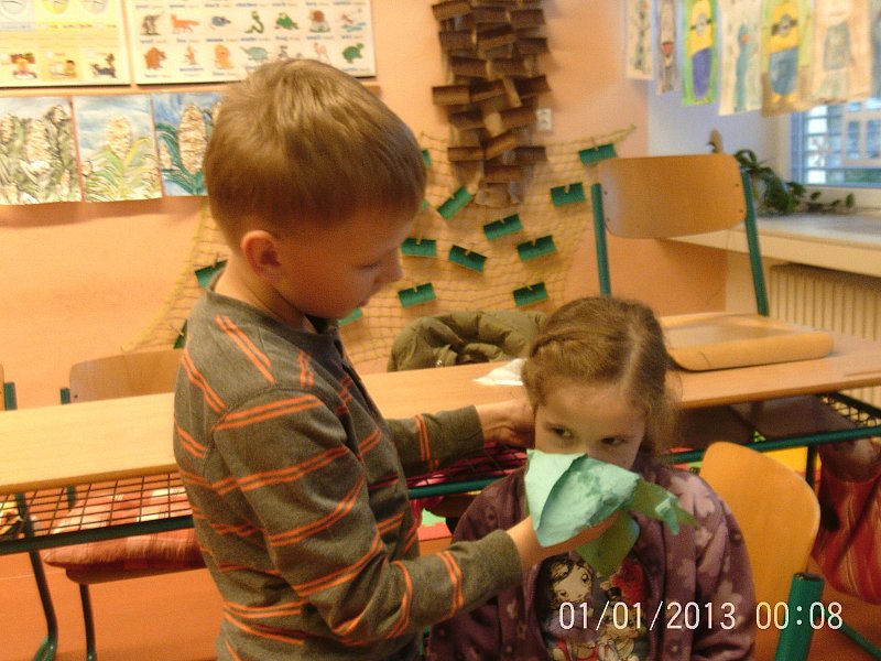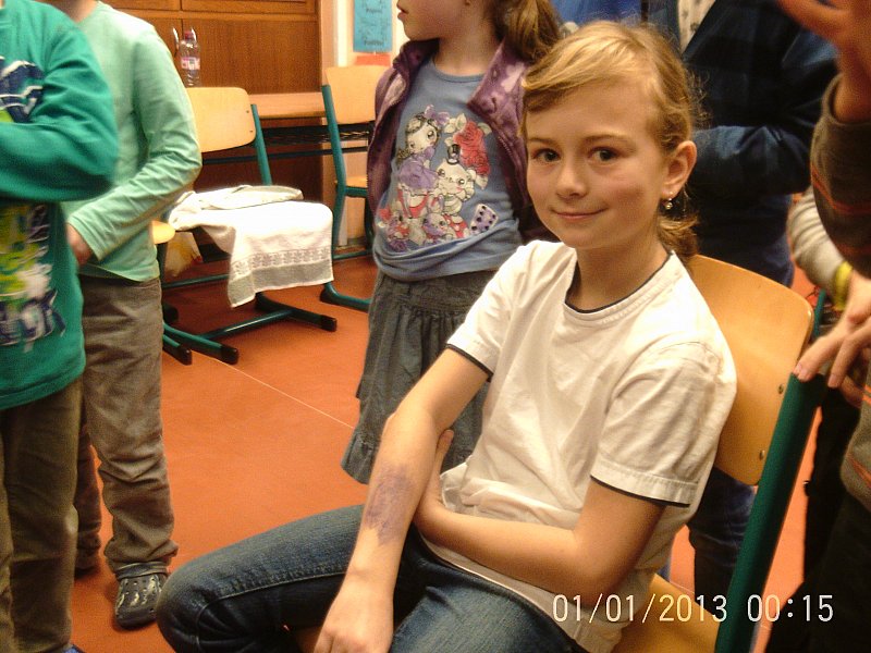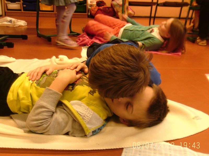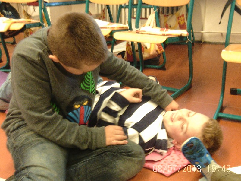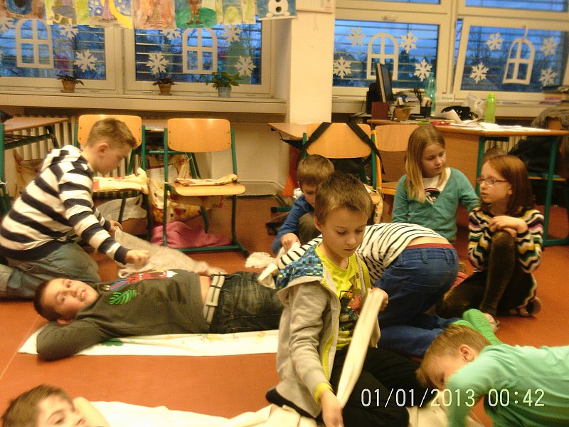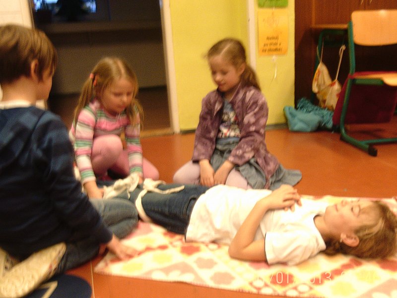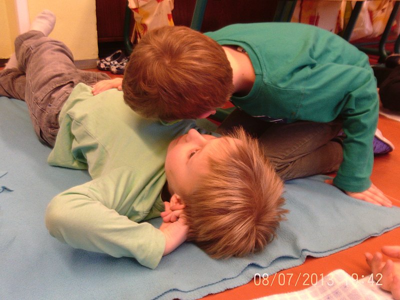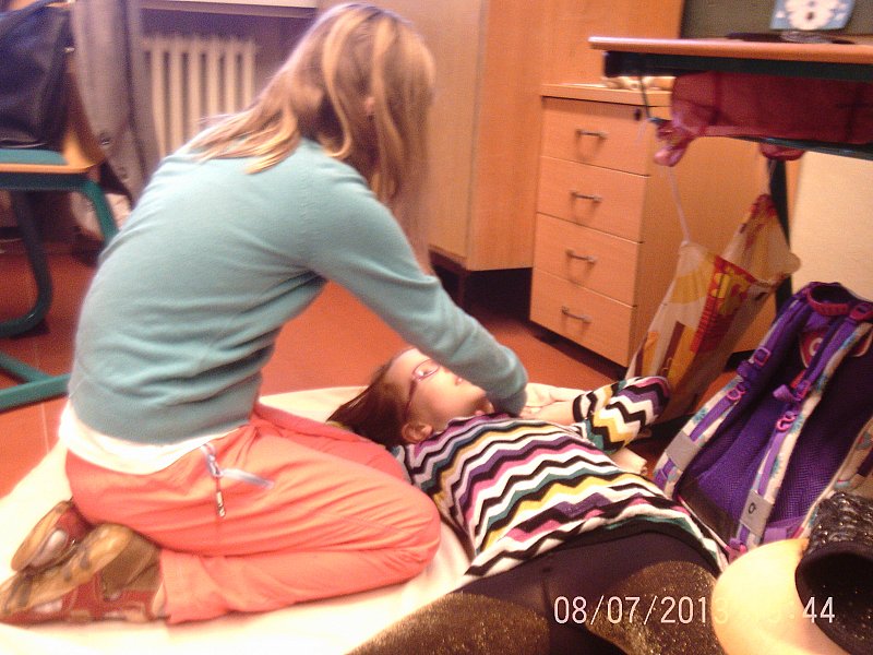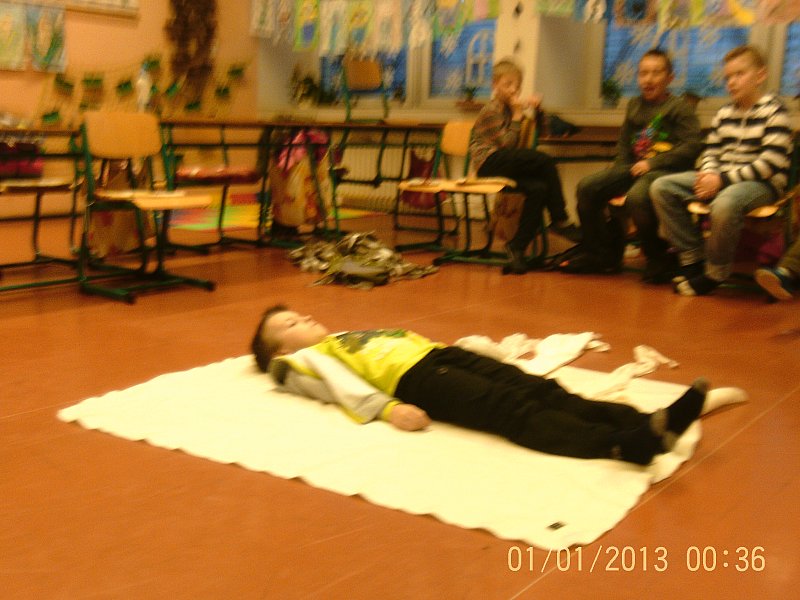 Děti si vyzkoušely spčítat svou dechovou frekvenci, změřit si tep, Na kamarádovi zjistit, zda dýchá, změřit mu tep, ošetřit krvácení z nosu, zafixovat zlomenou horní i dolní končetinu.