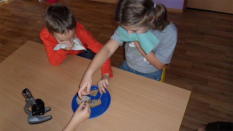 Na různá místa ve škole schováme krajíce chleba. Některé namočíme, jiné zabalíme do igelitu, s jiným nejdříve „vytřeme“ podlahu, prostě vše, co nás napadne. Jednotlivá místa označíme číslovkou a zapíšeme si polohu i popis chleba do tabulky.