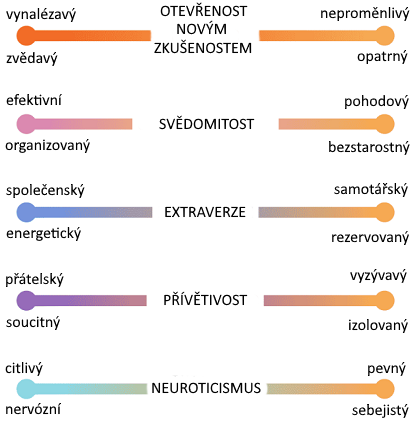 Teorií osobností je také mnoho. Ve výzkumech často používaná je teorie Big Five2. Tento teoretický model postupně vyvíjeli výzkumníci od roku 1949 až do roku 1981. Tato teorie u každého člověka rozlišuje 5 různých vlastností – otevřenost novým zkušenostem, svědomitost, extraverzi, přívětivost a neuroticismus. Každou z těchto vlastností si představte jako škálu, kde na jednom a druhém konci jsou opaky dané vlastnosti. Například vlastnost extraverze neměří jen extraverzi, ale zároveň i introverzi. Nebo neuroticismus měří zároveň emoční stabilitu apod.