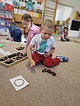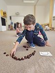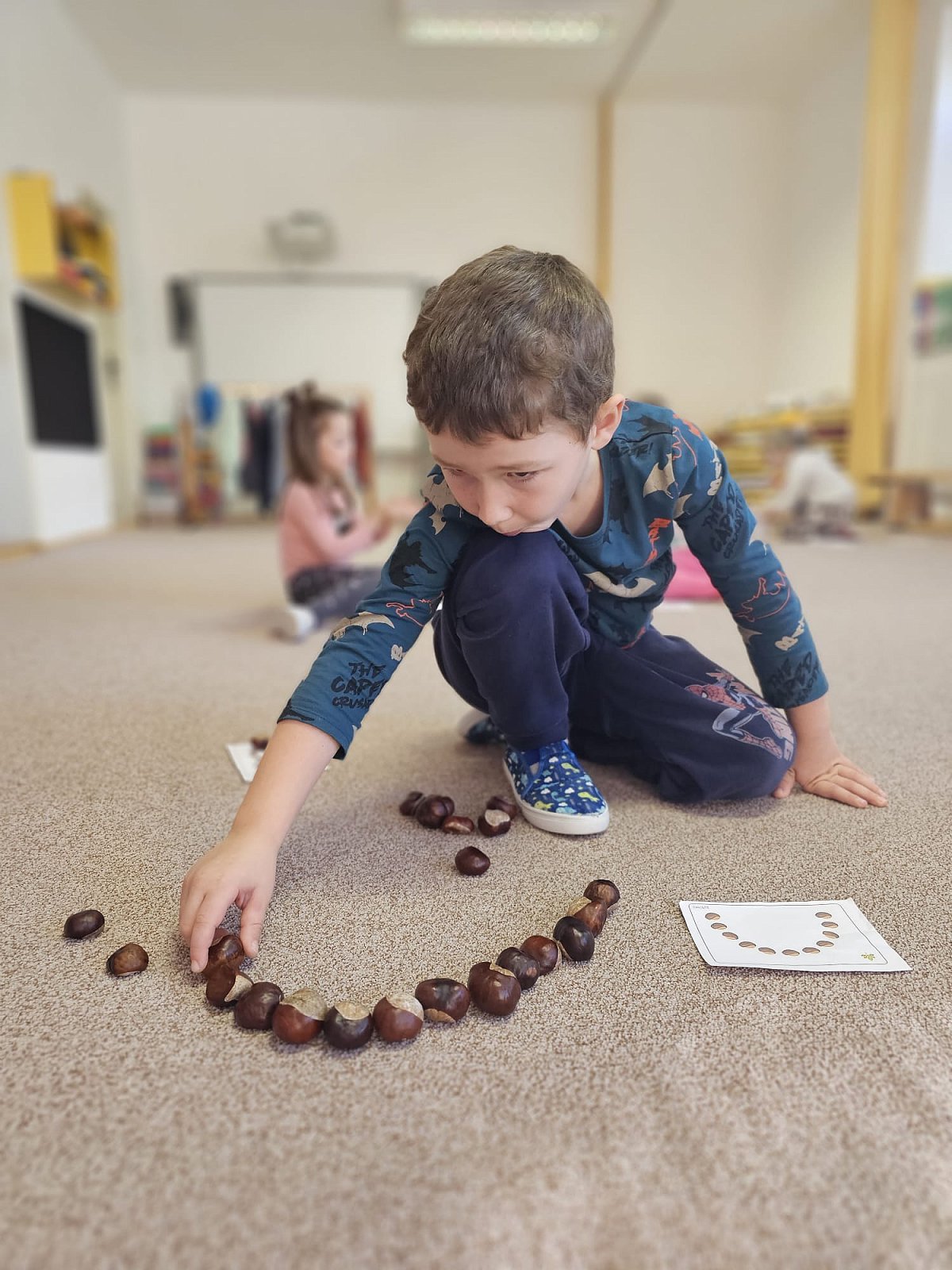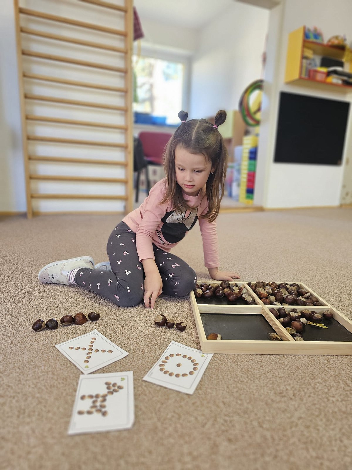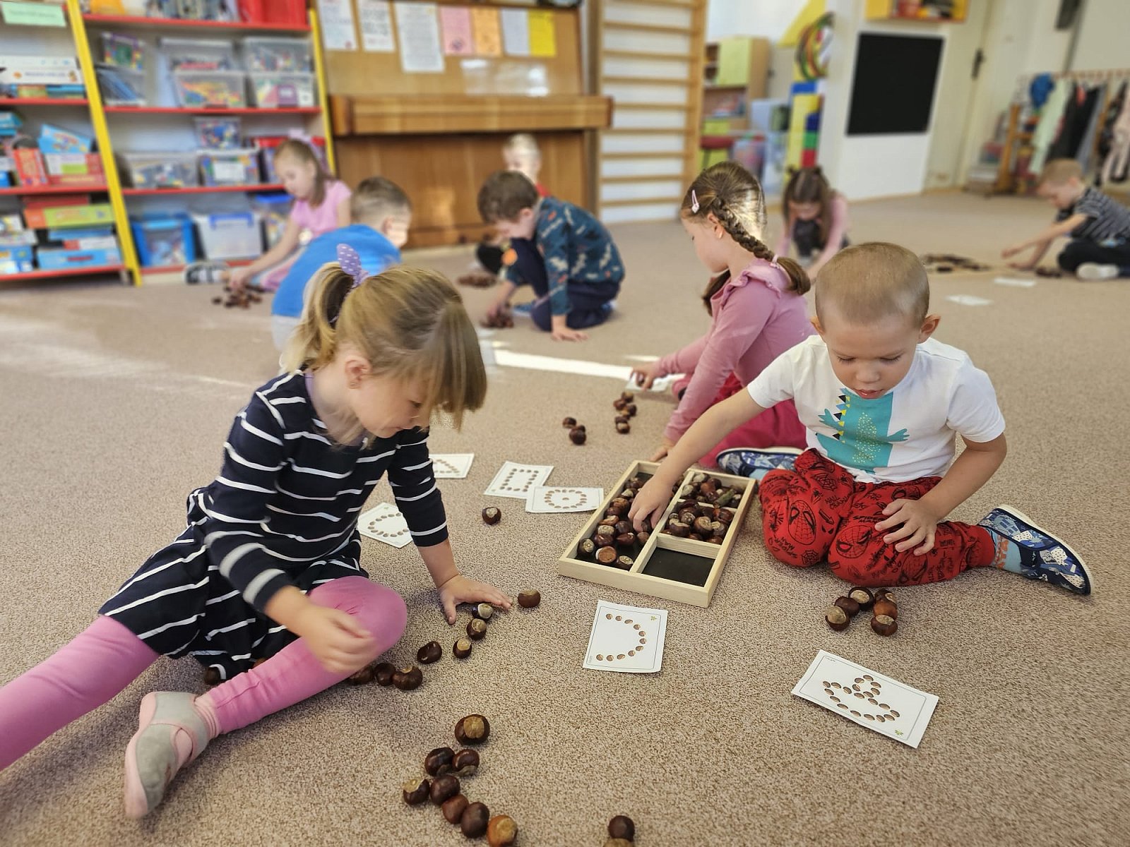 Tvoření obrázků z přírodnin, předmatematické představy, třídění dle tvaru, velikosti, počírání 1-10.