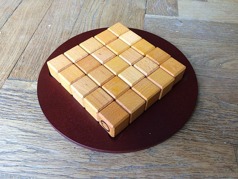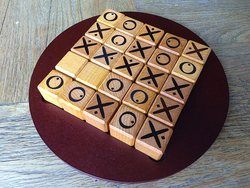 Hraje se na dřevěné podložce s 25 dřevěnými krychličkami, z nichž každá je označena na jedné plošce symbolem křížku, na druhé plošce symbolem kolečka; ostatní čtyři plošky jsou prázdné. Na začátku hry jsou na herní ploše rozloženy všechny krychličky do čtverce (5x5) a otočeny prázdnou ploškou vzhůru (Obr. 2).