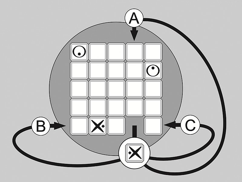 Hráči se dohodnou, kdo bude mít křížky a kdo kolečka, v tazích pravidelně střídají. Kdo je na řadě, vytáhne z některé okrajové řady krychličku, která byla dosud otočená nahoru prázdnou ploškou nebo jeho vlastním symbolem (nelze tedy vytáhnout krychličku s protihráčovým symbolem!). Hráč vloží tuto krychličku svým vlastním symbolem nahoru, ale na jiné místo herní podložky tak, že zvnějšku posune krychličky v jedné z řad, kde vznikla díra. S výjimkou „rohových“ děr je tedy možno každou krychličku vložit jedním ze tří způsobů (Obr. 3).