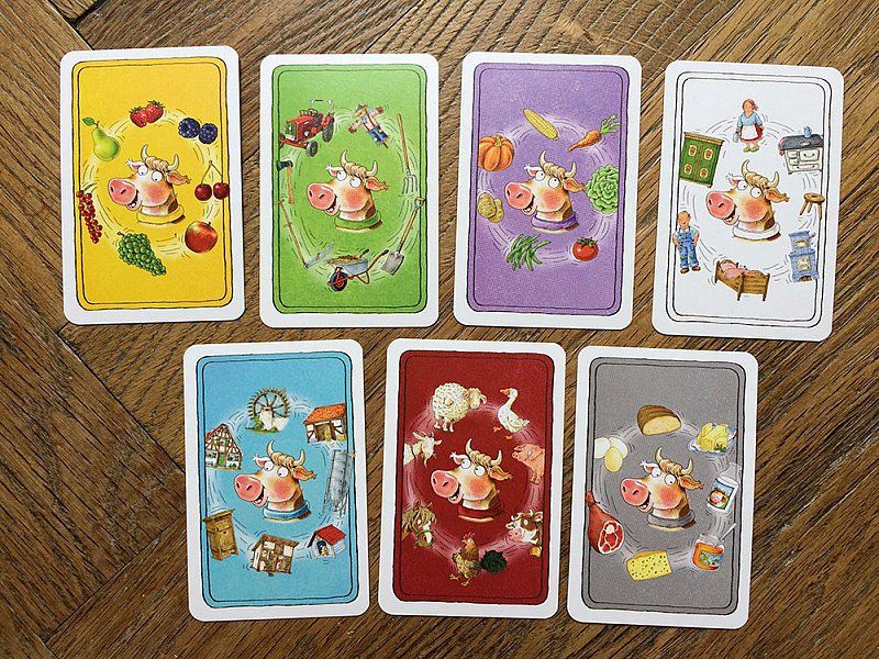 Ve fázi přípravy hry se na stůl vyloží sedm tematických karet s různě zbarveným pozadím. Ve variantě Ty krávo! (Alles Tomate!) jsou to následující okruhy témat: