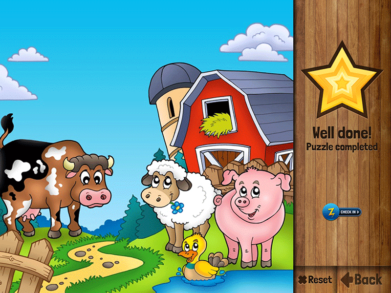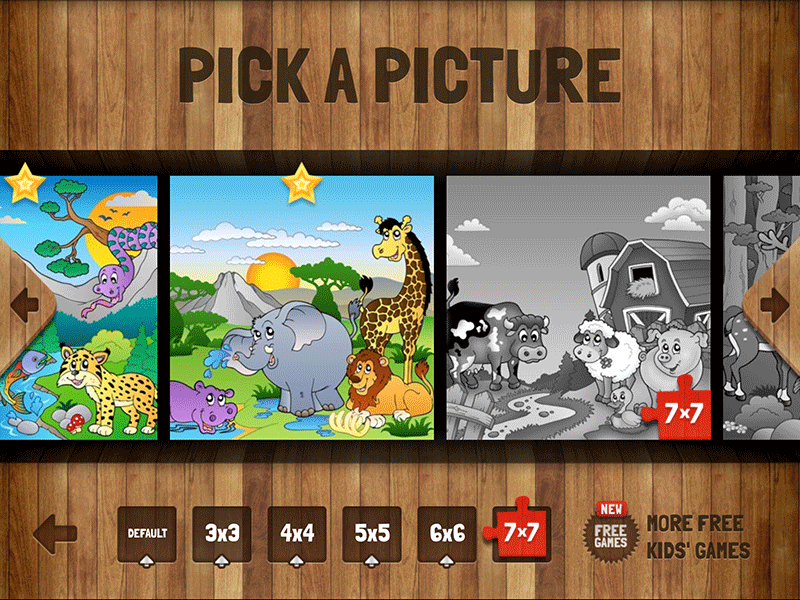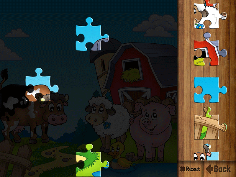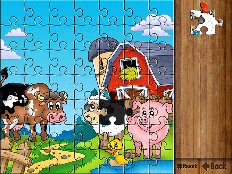 Klasické skládačky (puzzle) pro nejmenší. Dítě si může vybírat mezi desítkami obrázků, které jsou v aplikaci obsaženy. K dispozici je několik úrovní obtížnosti, lišící se počtem dílků (3x3 až 7x7).