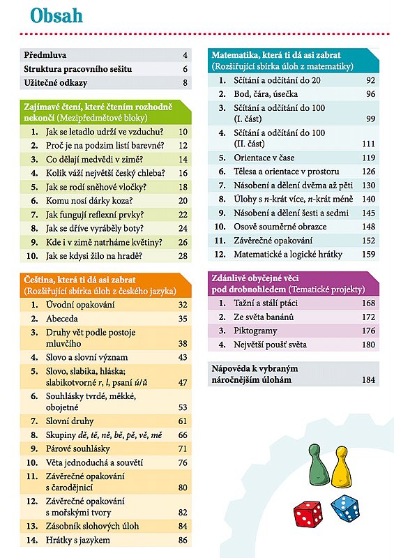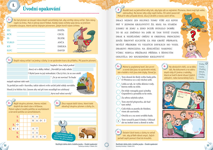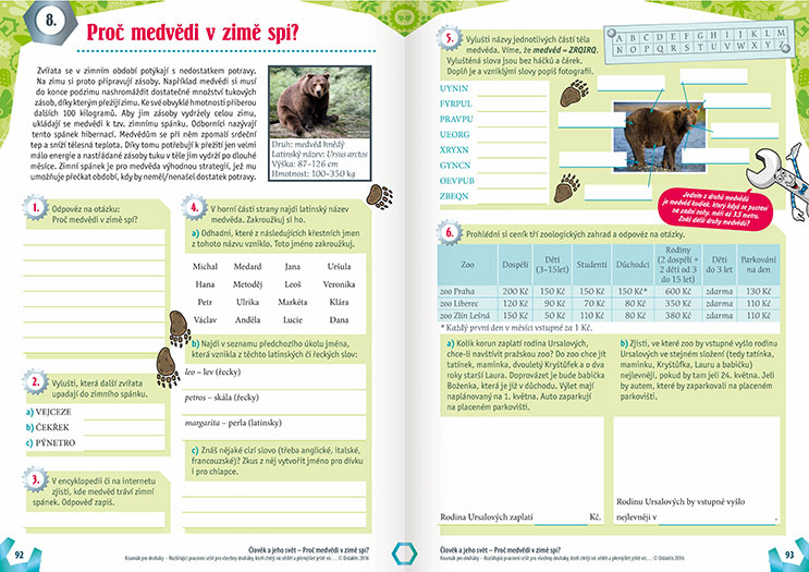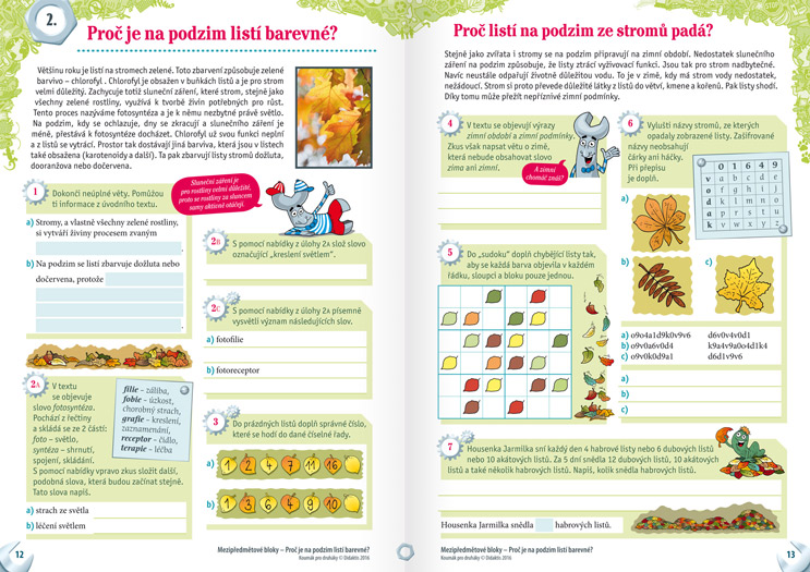 - Úlohy z oblasti češtiny navazují na některý klíčový výraz tématu a nabízí práci s frazémy, významy slov i cizími slovy, a celkově tak rozvíjí jazykový cit dětí.