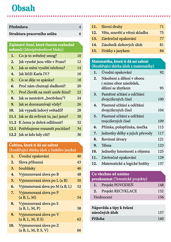Pracovní sešit se skládá ze čtyř částí. V klíčových částech odpovídá řazení témat jejich pořadí v učebnicích 3. ročníku základní školy. Díky tomu sešit umožňuje variabilně doplňovat běžné hodiny, a nabízí tak dětem dostatek různorodých aktivit a podnětů po celý rok.